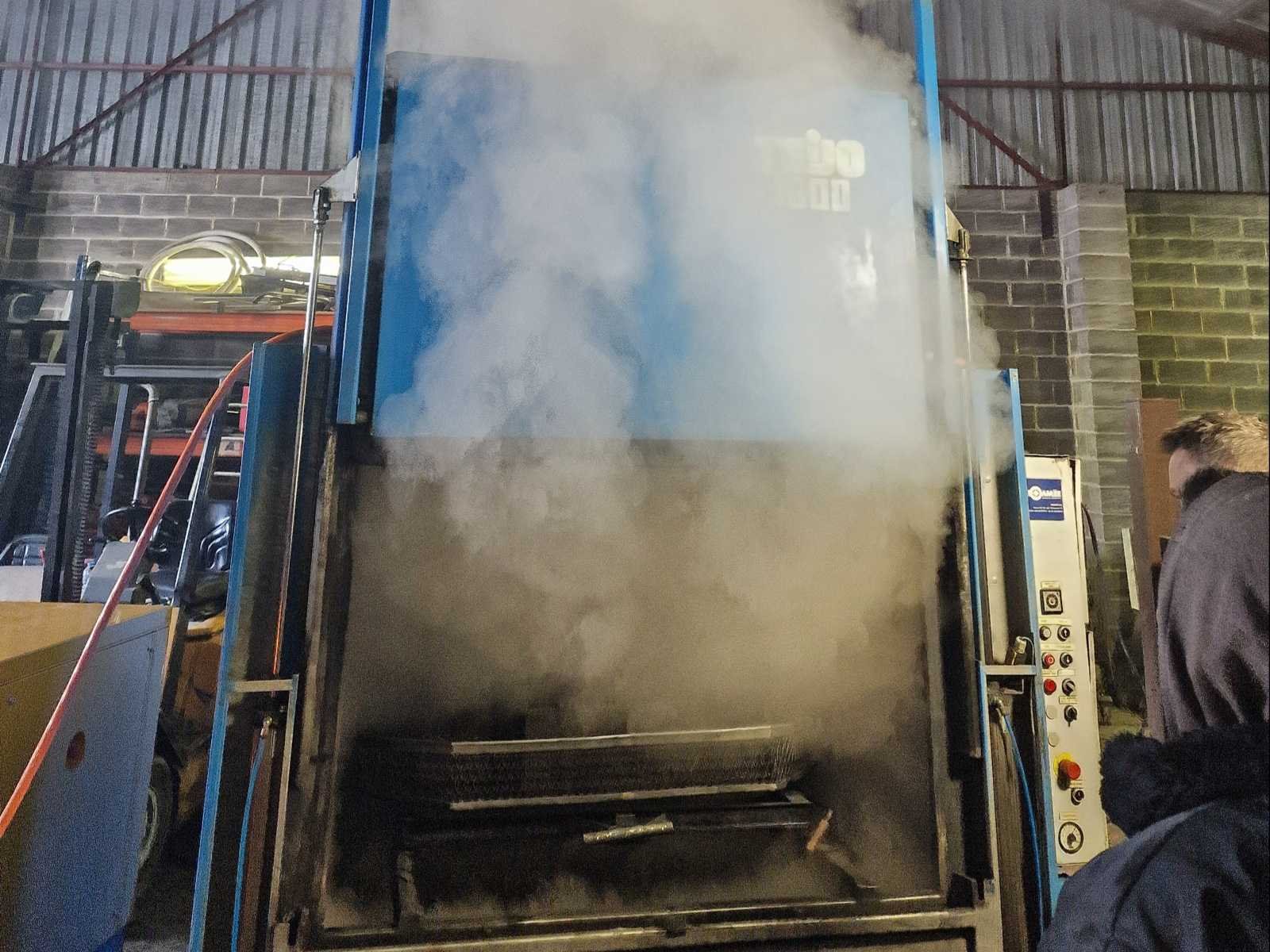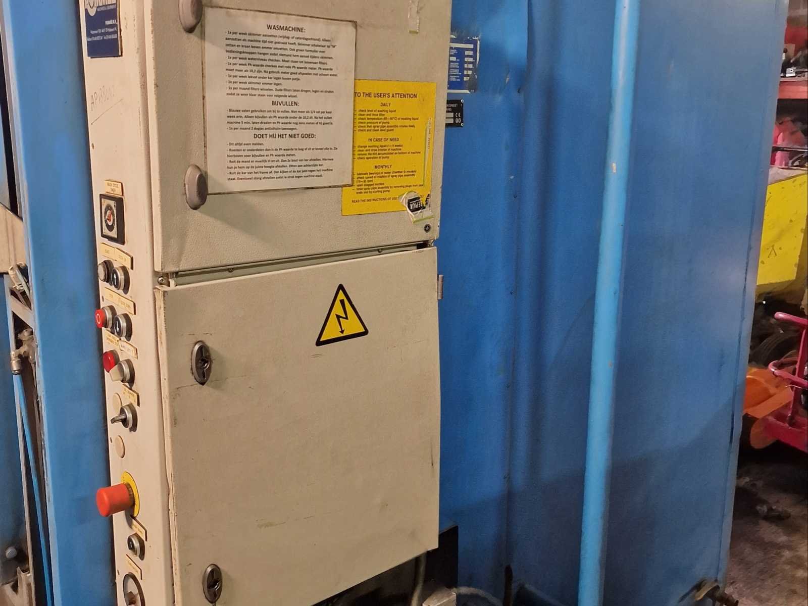 Merk: TEIJO Pesukoneet Oy (Finland) Model/Type: C-1600 PD 1 Serienummer: 50512 Tankcapaciteit: 1400 liter Pompdebiet: 470 l/min Aansluitvermogen: 25 kW Spanning: 3x400 V / 230 V (230 V regeling) Het is een industriële wasmachine voor mechanische onderdelen, die in de werkplaats wordt gebruikt om onderdelen (motoren, landbouwonderdelen, industriële onderdelen, enz.) te reinigen door te spuiten met heet water + detergent. No Merk: TEIJO Pesukoneet Oy Type: C-1600 PD 1 Serienummer: 50512