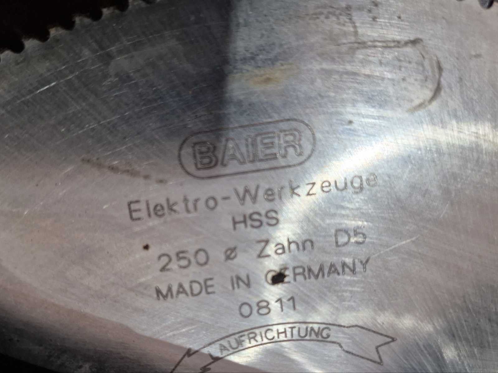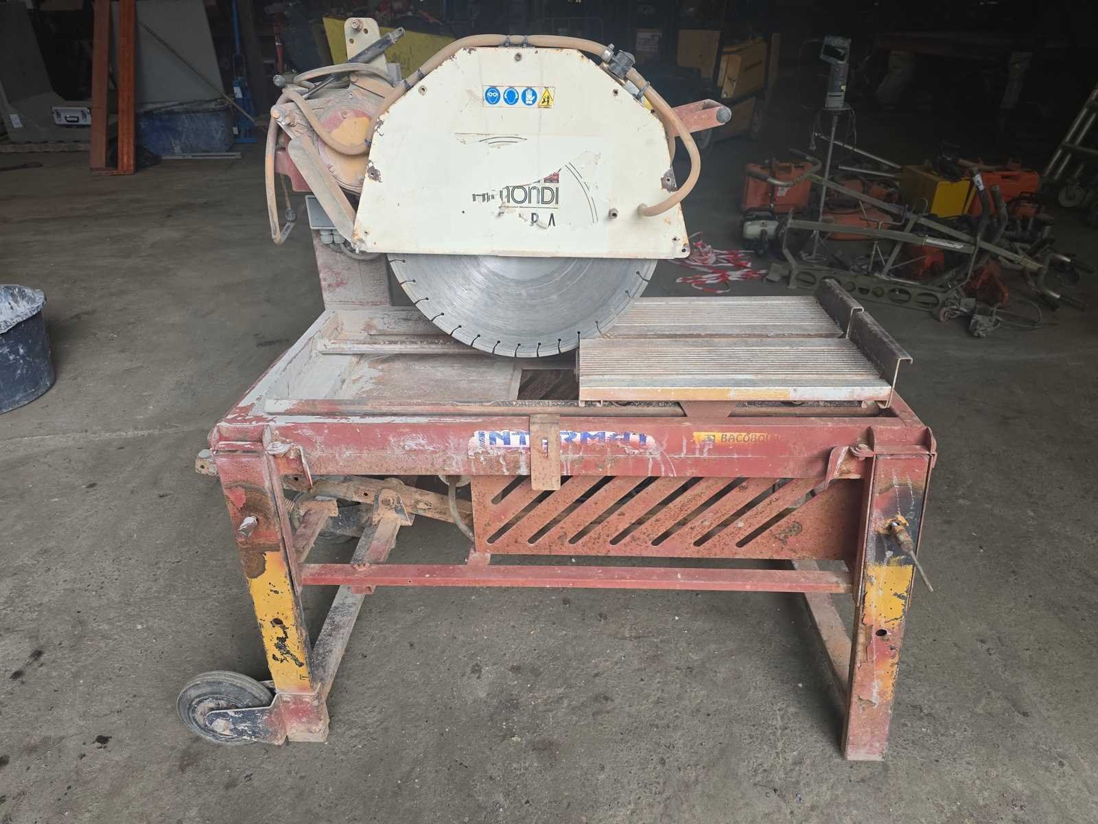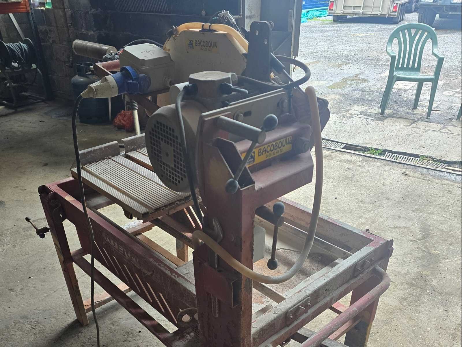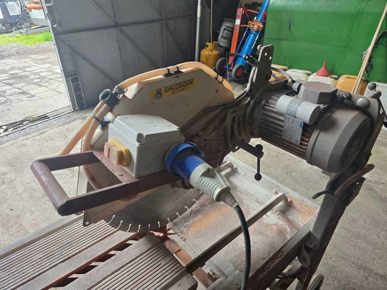 Groot diamantblad Ø 250 mm (BAIER) Driefasige elektromotor Schuiftafel met rails Watersproeisysteem (zichtbare slangen om het blad te koelen en stof te beperken) Chassis op wielen voor bouwplaatsen No