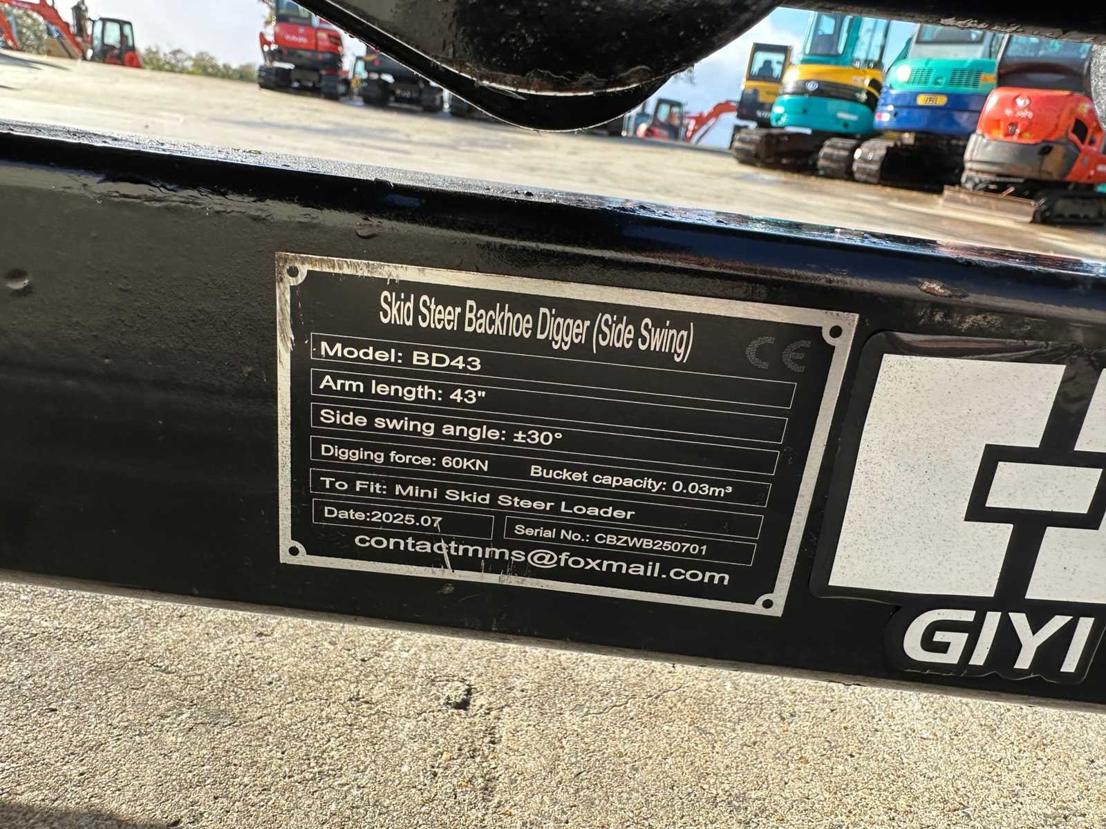 -Nieuw -Bakbreedte : 310mm -Hydraulische aansluiting -Zwenkend Nee Merk: Giyi Type: BD43 Bouwjaar: 2025 Serienummer: CBZWB250701 Totale afmeting L: 1700mm Totale afmeting Breedte: 900mm Totale afmeting Hoogte: 520mm