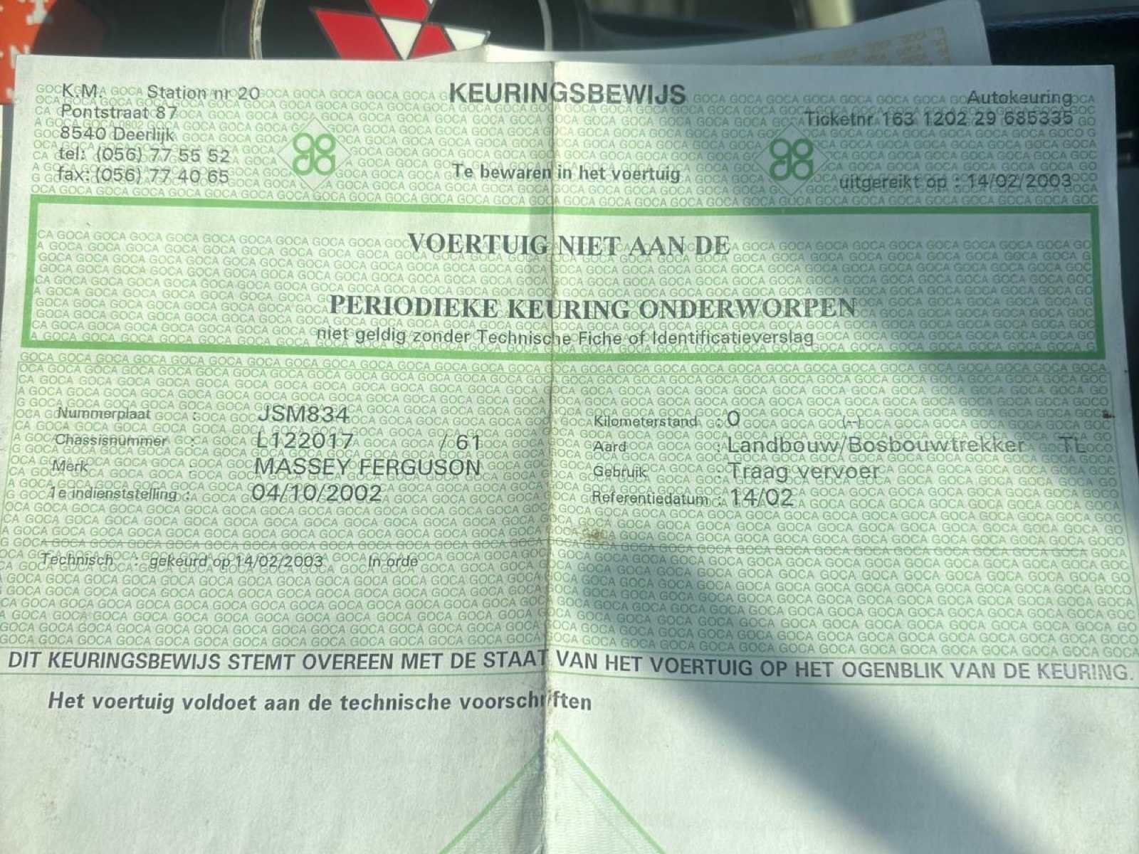 No Merk: Massey Ferguson Type: 8240 Bouwjaar: 2002 Serienummer: L122017 Fronthefinrichting: true Cabine: true Luchtgeveerde stoel: true Totale afmeting L: 4600mm Totale afmeting Breedte: 2400mm Totale afmeting Hoogte: 2900mm Kentekenpapieren compleet?: true Chassisnummer: L122017 Datum eerste toelating: 04/10/2002 Nationaliteit documenten: BE