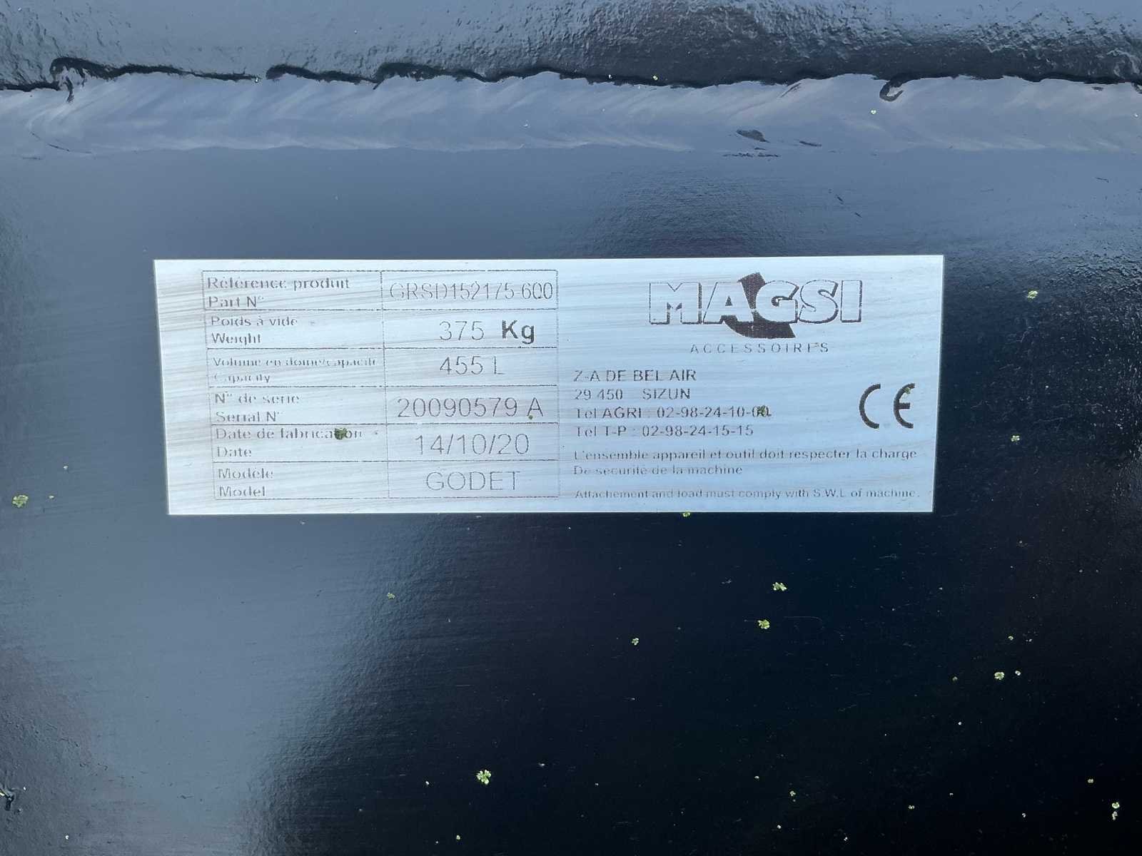 450 liter No Merk: Magsi CW 30 Type: Godet Bouwjaar: 2020 Serienummer: 20090579A Graafbak afm. b: 600mm Dieplepelbak: true Met tanden: true Eigen gewicht: 375kg