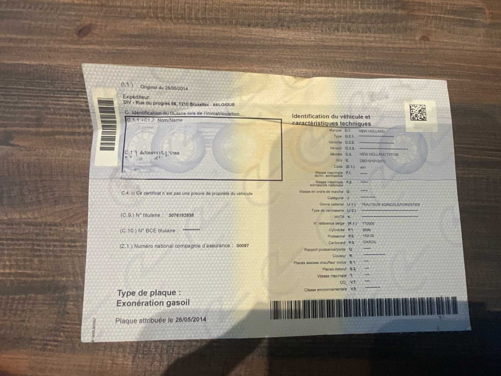 New Holland TVT195 4WD-tractor, uitgerust met een continu variabele transmissie (CVT) en goedgekeurd voor 50 km/u. Veelzijdige en hoogpresterende machine, in goede algemene staat, gebruikt in een agrarische omgeving. Het TVT195-model staat bekend om zijn rijcomfort, constante vermogen en gecontroleerde verbruik. Geen zorgen Niets om te plannen Uitrusting en staat Hangende en geklimatiseerde cabine Luchtvering comfort seat Multifunctionele joystick en ergonomische armleuning Extra scherm (camera of GPS) 4 achterste hydraulische spoelkleppen Automatische trekhaak, hydraulische hefarmen Verticale uitlaat Werklichten voor en achter No Merk: New Holland Type: TVT195 4WD Bouwjaar: 2014 Serienummer: DBD101012 Motorvermogen (kW): 143kW Afgelezen urenstand: 10215 Versnellingsbaktype: CVT Aantal hydraulische ventielen voor: 0 Aantal hydraulische ventielen achter: 4 Cabine: true Luchtgeveerde stoel: true Chassisnummer: DBD101012 Datum eerste toelating: 2014 Nationaliteit documenten: België