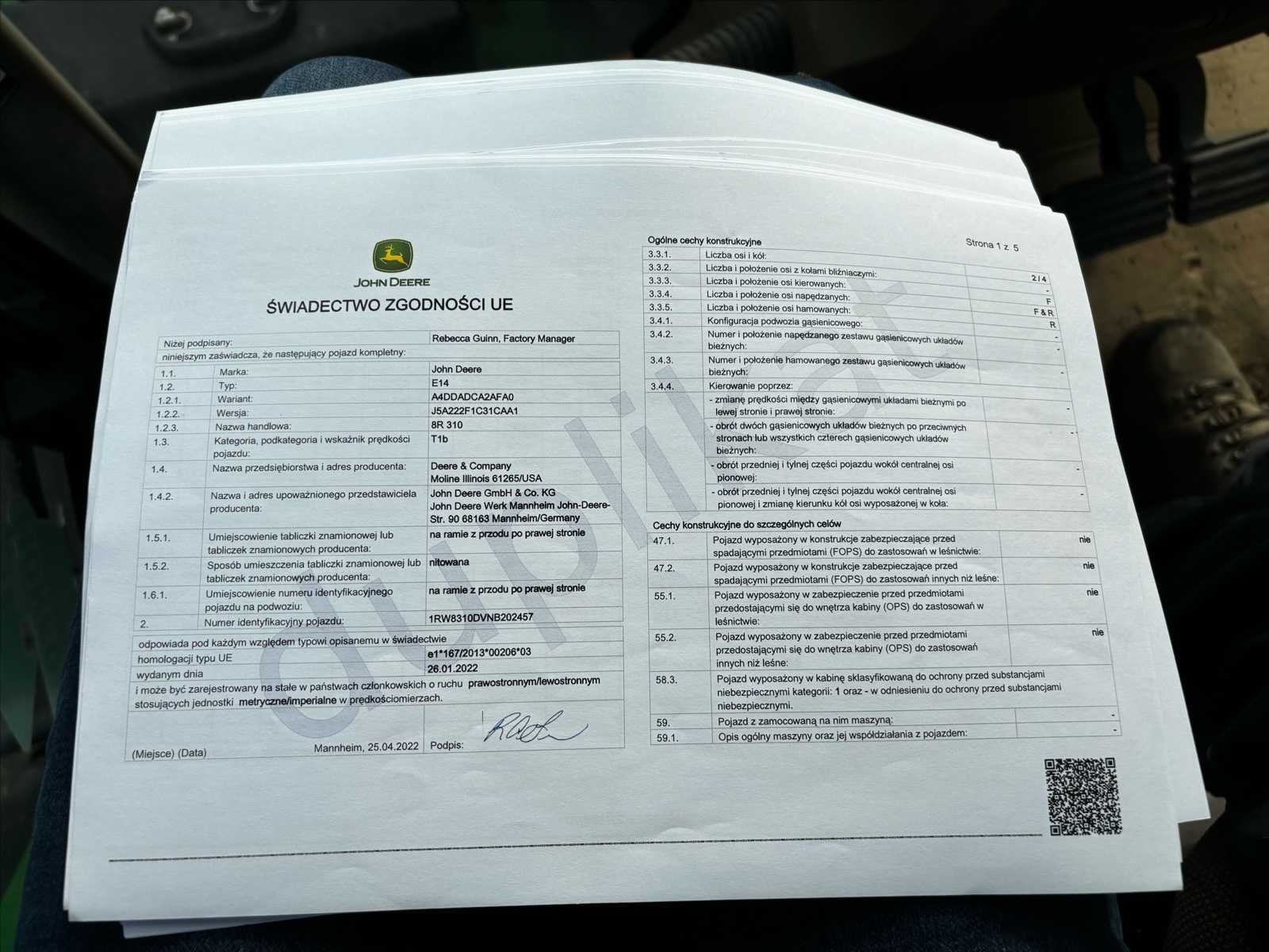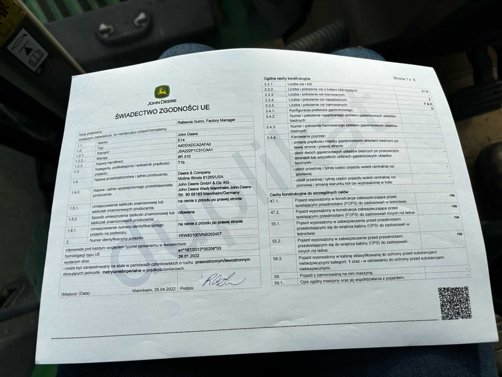 John Deere 8R 310 landbouwtractor, jaar 2022, in zeer goede algehele staat. Krachtige machine die perfect geschikt is voor intensief werk. 🔧 Belangrijkste kenmerken • John Deere PowerTech 6-cilinder motor – Stage V (AdBlue) • Transmissie: e23 • ILS ophanging vooras • 5 achterste hydraulische spoelkleppen (Load Sensing – hoge doorstroming) • Achterste PTO 1000 / 1000E • Hoogcapaciteit achterste verbinding • Premium CommandView-cabine • Luchtveringsstoel • Hydraulisch systeem met hoge capaciteit • Automatische achterste koppeling • Voorgewicht inbegrepen ⚙️ Banden • Achterbanden: 650/85 R38 ⚖️ Gewicht • Inbouwgewicht: ± 12.500 kg 📌 Status • Goede algehele conditie • Klaar voor gebruik • Normale slijtage die overeenkomt met leeftijd en werktijden No Merk: John Deere Type: 8R 310 Bouwjaar: 2022 Serienummer: 1RW8310DVNB202457 Motorvermogen (kW): 228kW Afgelezen urenstand: 3128 Versnellingsbaktype: E 23 Powershift Aftakastoerental: 1000rpm Aantal hydraulische ventielen voor: 0 Aantal hydraulische ventielen achter: 5 Bandenmaat voor: 600/70 R30 Bandenmaat achter: 650/85 R38 Frontgewichtenset: true Cabine: true Luchtgeveerde stoel: true Eigen gewicht: 12500kg Chassisnummer: 1RW8310DVNB202457 Nationaliteit documenten: België