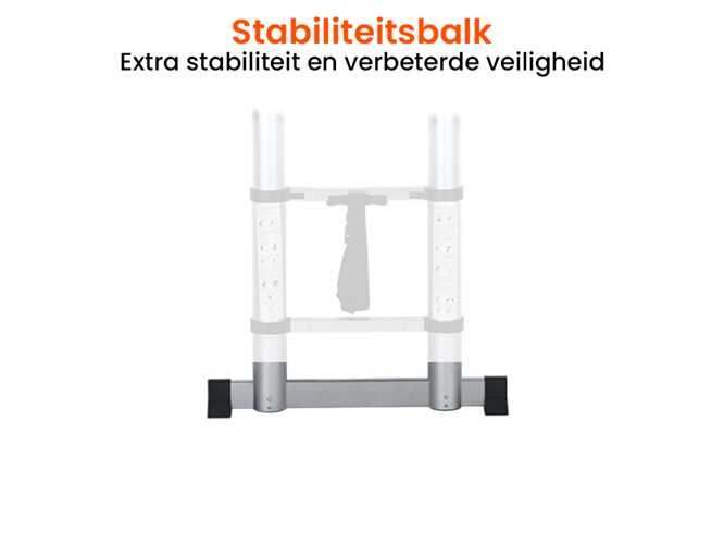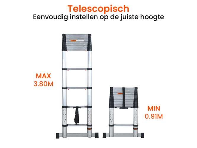 Gewicht 11.7 kg Afmetingen 50 × 380 cm Kleur Zwart/Zilver Werkhoogte 3,80 meter Hoogte ingeklapt 91 centimeter Aantal treden 13 Ruimte tussen treden 30 centimeter Softclose Ja Stabiliteitsbalk Ja Keurmerken CE, EN131-6 Merk Kibani Nee