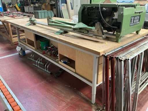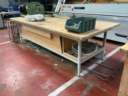Enkel de werktafel zonder inhoud wordt aangeboden. Houten werkblad op ijzeren voet, verstelbaar in hoogte. Nee Breedte: 130mm Lengte: 300mm