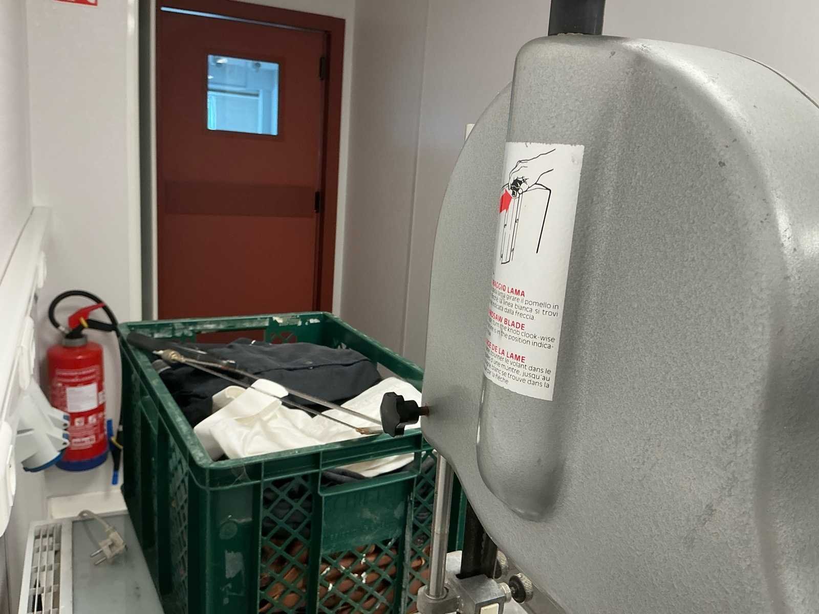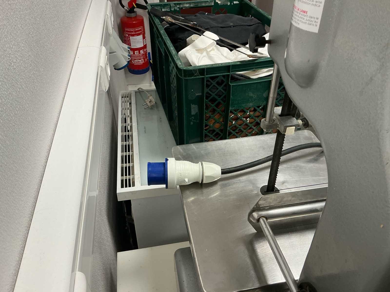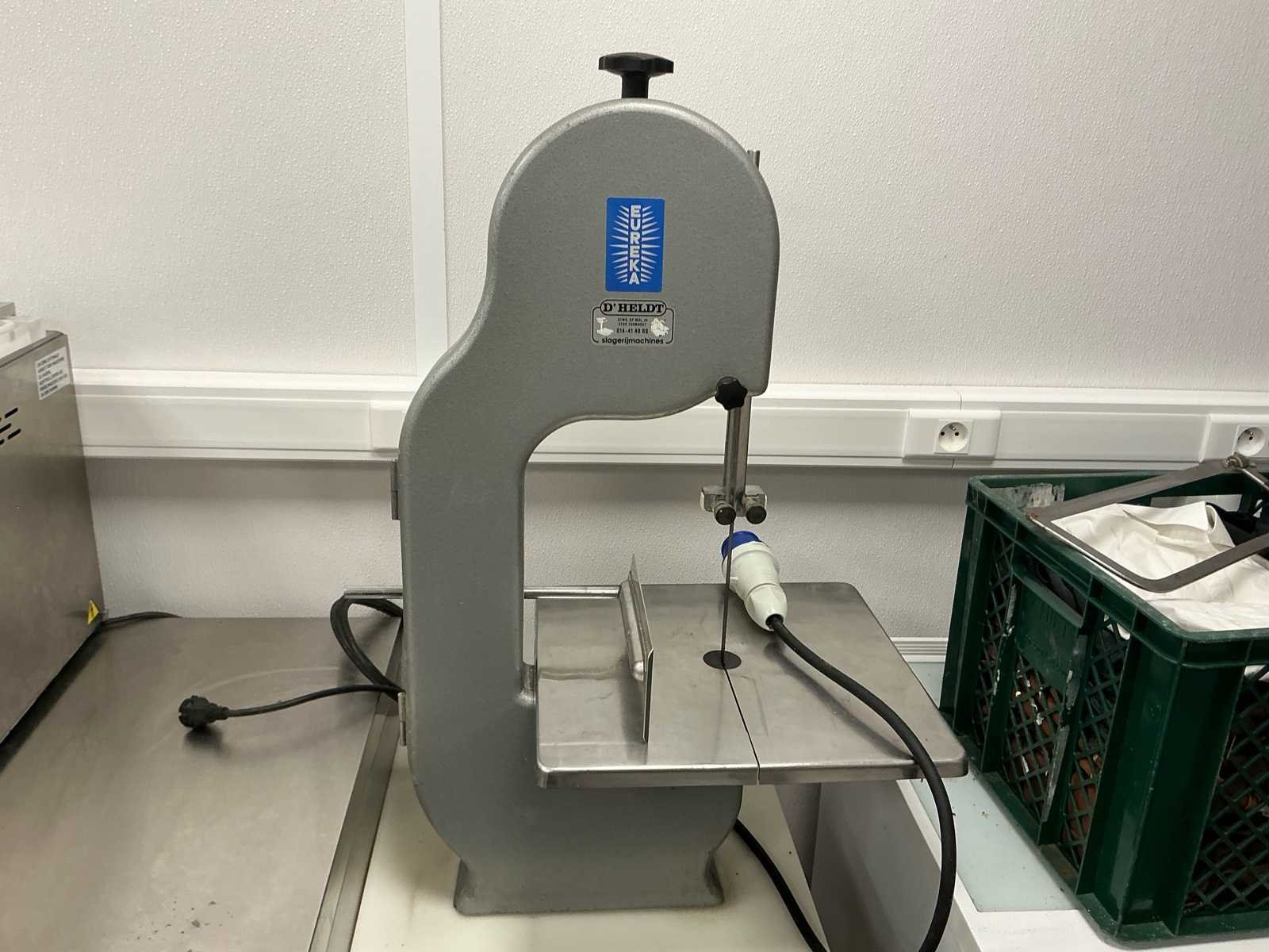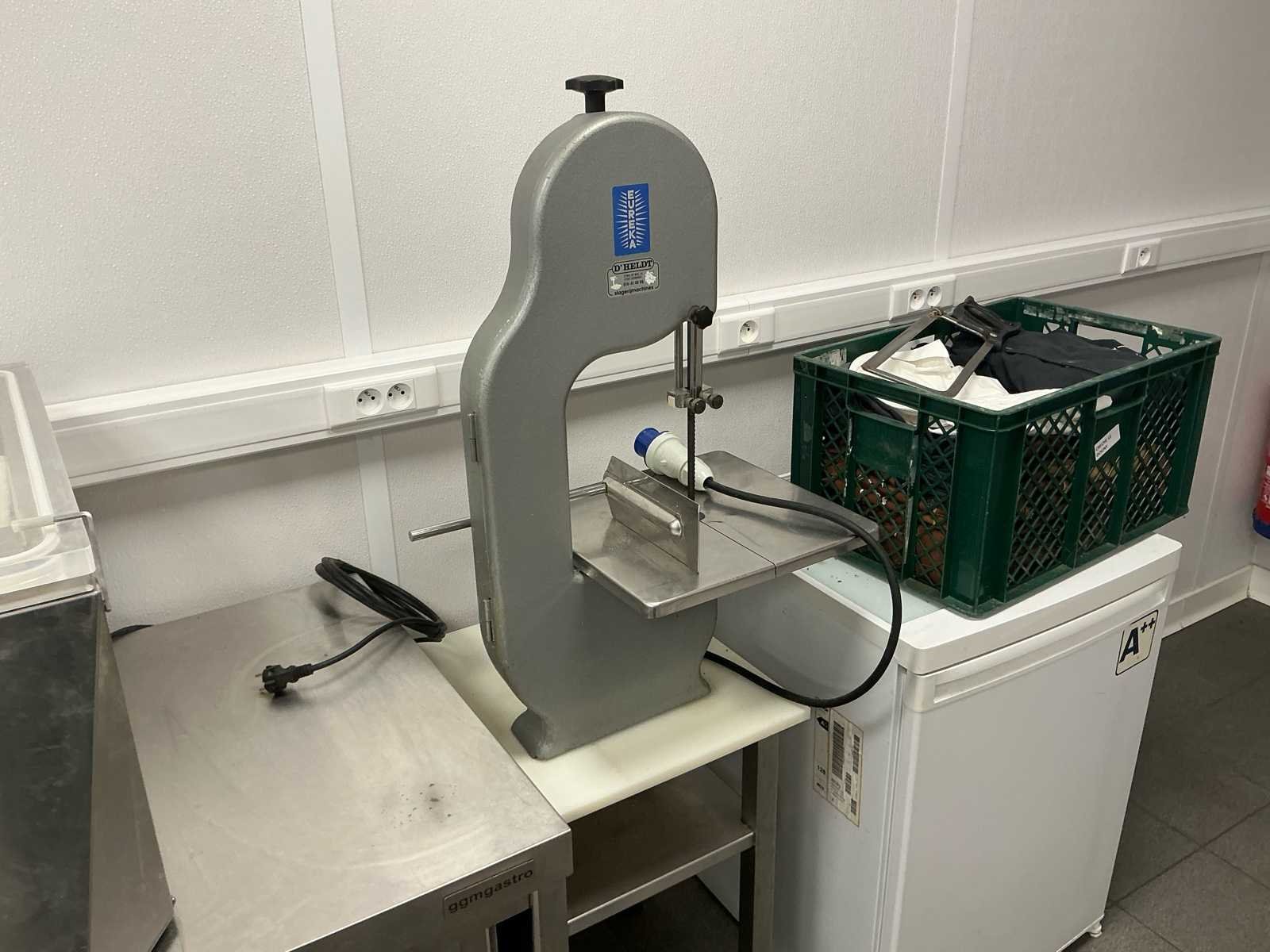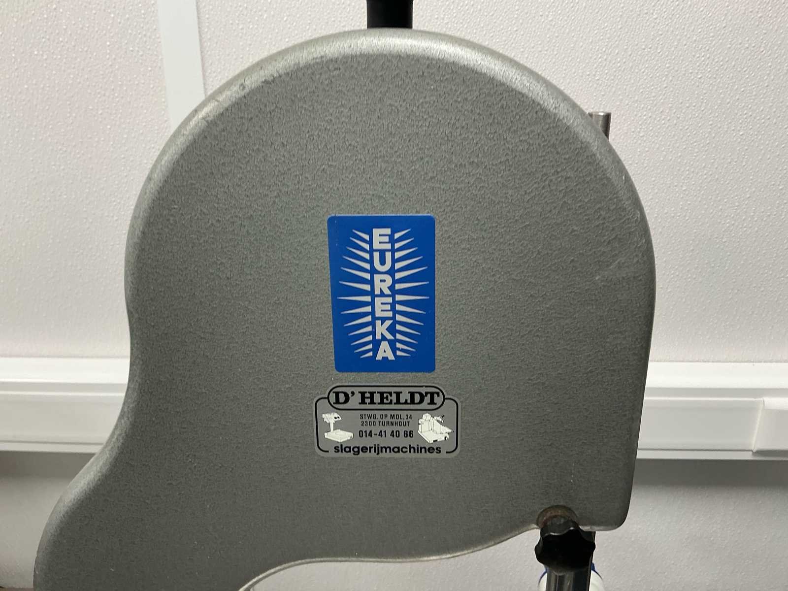 De vleeslintzaag bevindt zich in gebruikte maar werkende staat. De zaag zit vast een een tafelje, behoord tot het lot. No Merk: Eureka Type: Vleeslintzaag Aansluiting: 300V