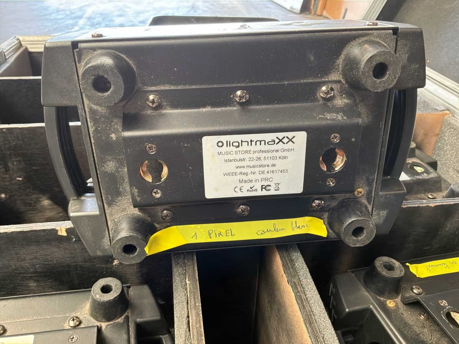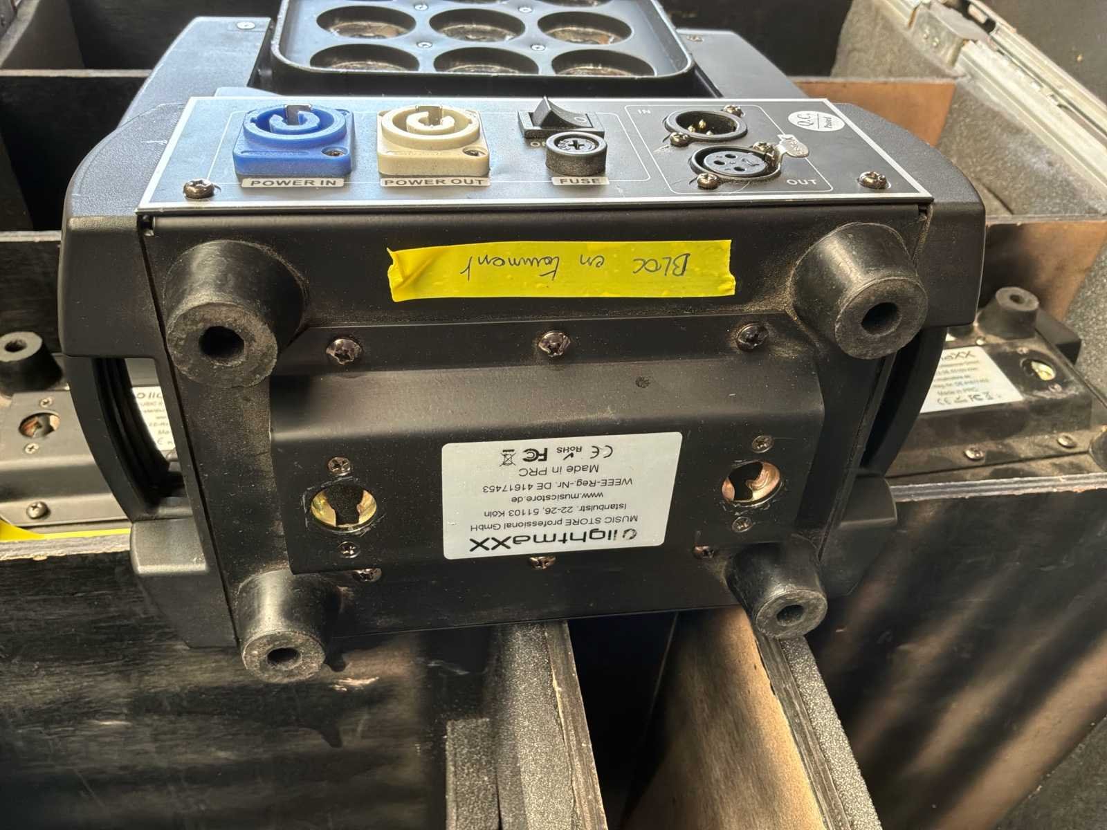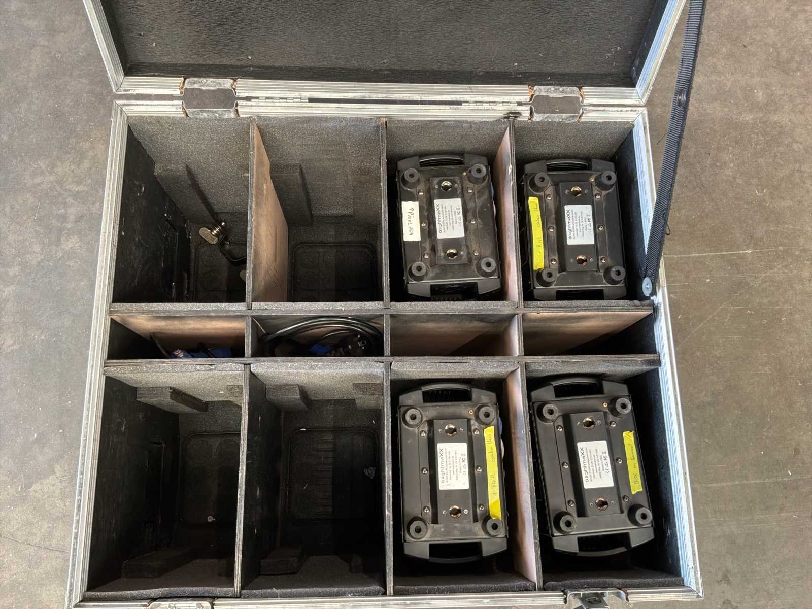 Defect gemeld op foto's Set van 4 bewegende koppen met flycase No Merk: Ligntmaxx Type: Dega matrix wash Serienummer: Zie foto's