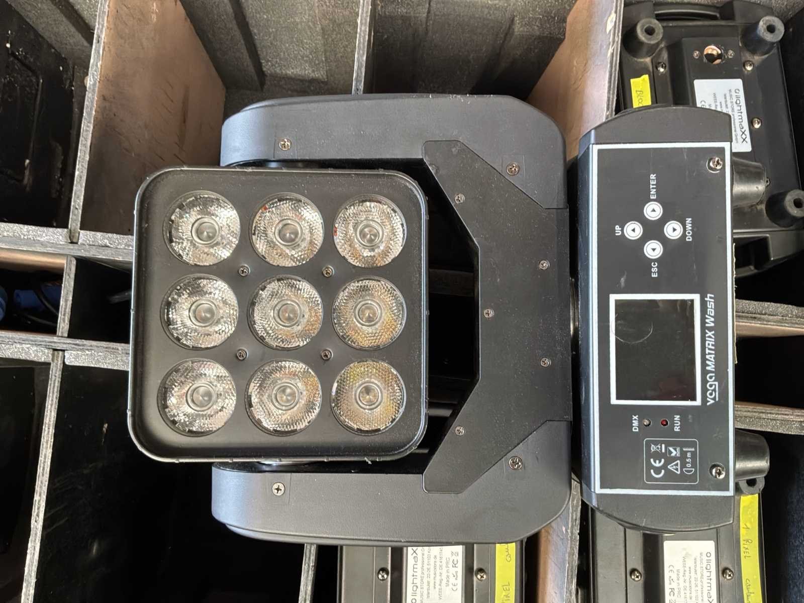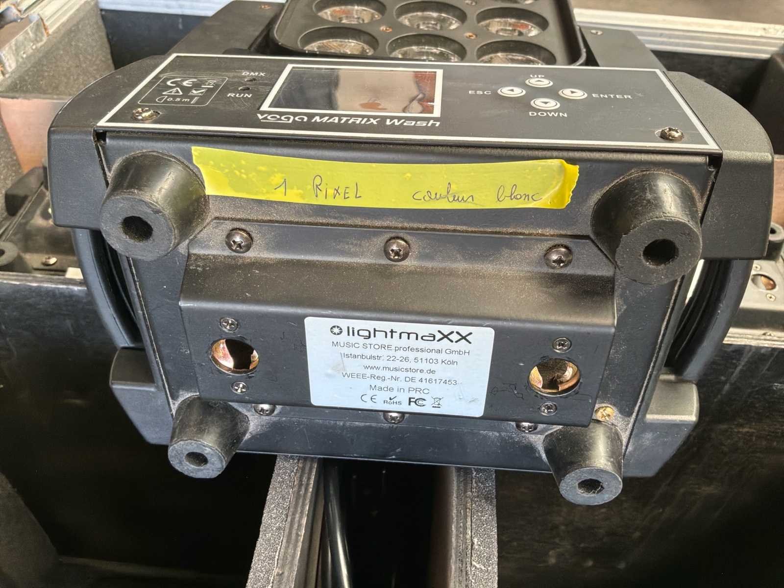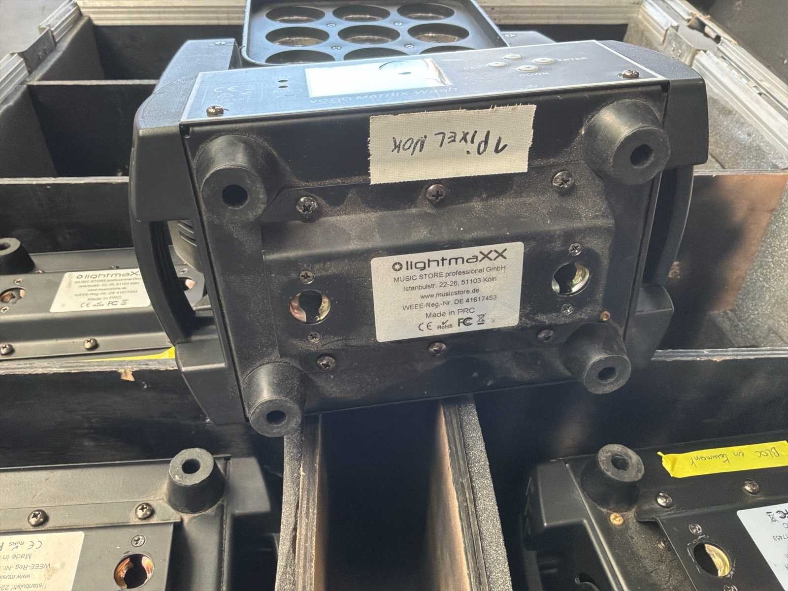 Defect gemeld op foto's Set van 4 bewegende koppen met flycase No Merk: Ligntmaxx Type: Dega matrix wash Serienummer: Zie foto's