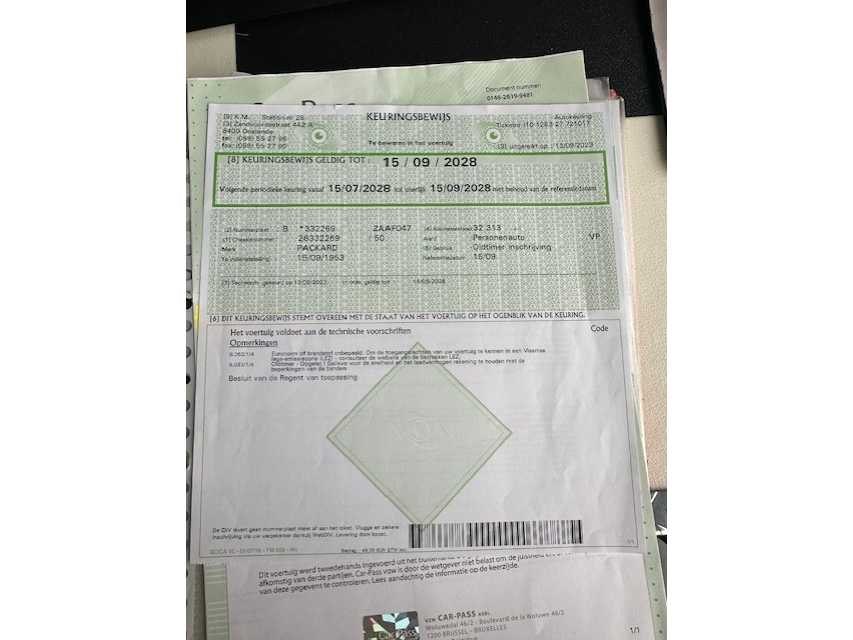 Please check for yourself what requirements there are in your country for the registration of this vehicle No Merk: Packard Bouwjaar: 1953 Chassisnummer: 26332269 Afgelezen mijlenstand: 32187mi Brandstof: benzine Datum eerste toelating: 15/09/1953 Nationaliteit documenten: USA Kentekenpapieren compleet?: true Carrosserie: Personenauto Transmissie: Manual transmission Aantal deuren: 3 Aantal zitplaatsen: 3 Stuurwiel: left Kleur: green Cilinderinhoud: 5400 Aantal cilinders: 8
