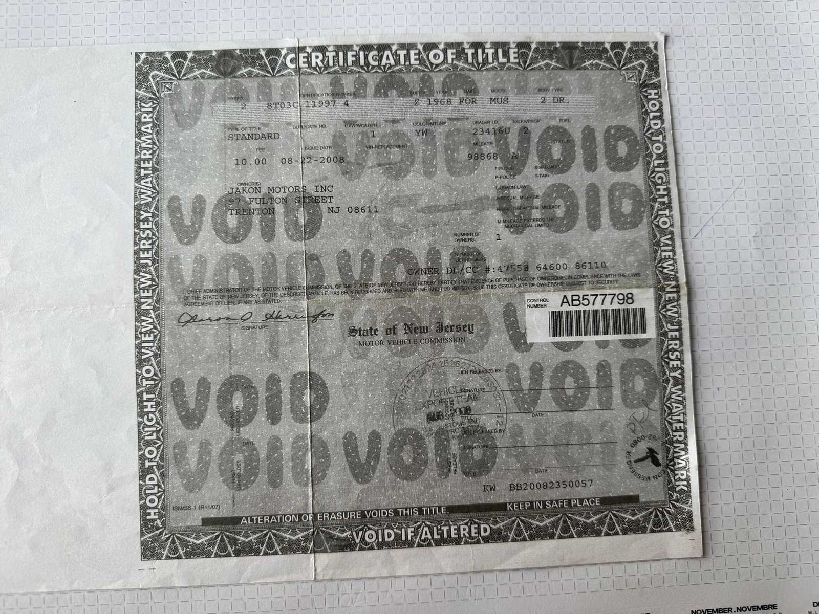 115.000 km 15/09/1968 4722 cc V8 elektrisch dak alu velgen automaat No Merk: Ford Model: Mustang Bouwjaar: 1968 Afgelezen kilometerstand: 115000km Cilinderinhoud: 4722cc Brandstof: Benzine Chassisnummer: 8T03C119974 Datum eerste toelating: 15/09/1968 Kleur: geel Transmissie: Automaat Inschrijvingsbewijs - deel 1 : aanwezig Inschrijvingsbewijs - deel 2: aanwezig