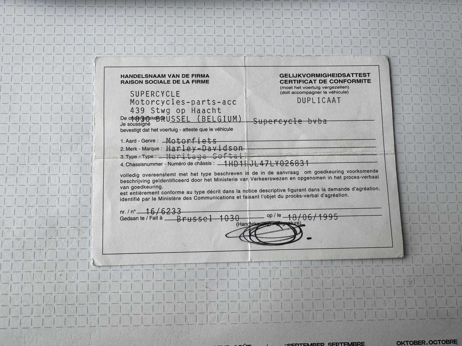 No Merk: Harley Davidson Model: Heritage Type: Panhead Brandstof: benzine Chassisnummer: 1HD1BJL47LY026831 Cilinderinhoud: 1340cc Datum eerste toelating: 26/04/1990 Vermogen (kW): 35kW Kleur: Groen Afgelezen kilometerstand: 15094km Nationaliteit documenten: Belgisch Boorddocumenten aanwezig?: true Bouwjaar: 1990