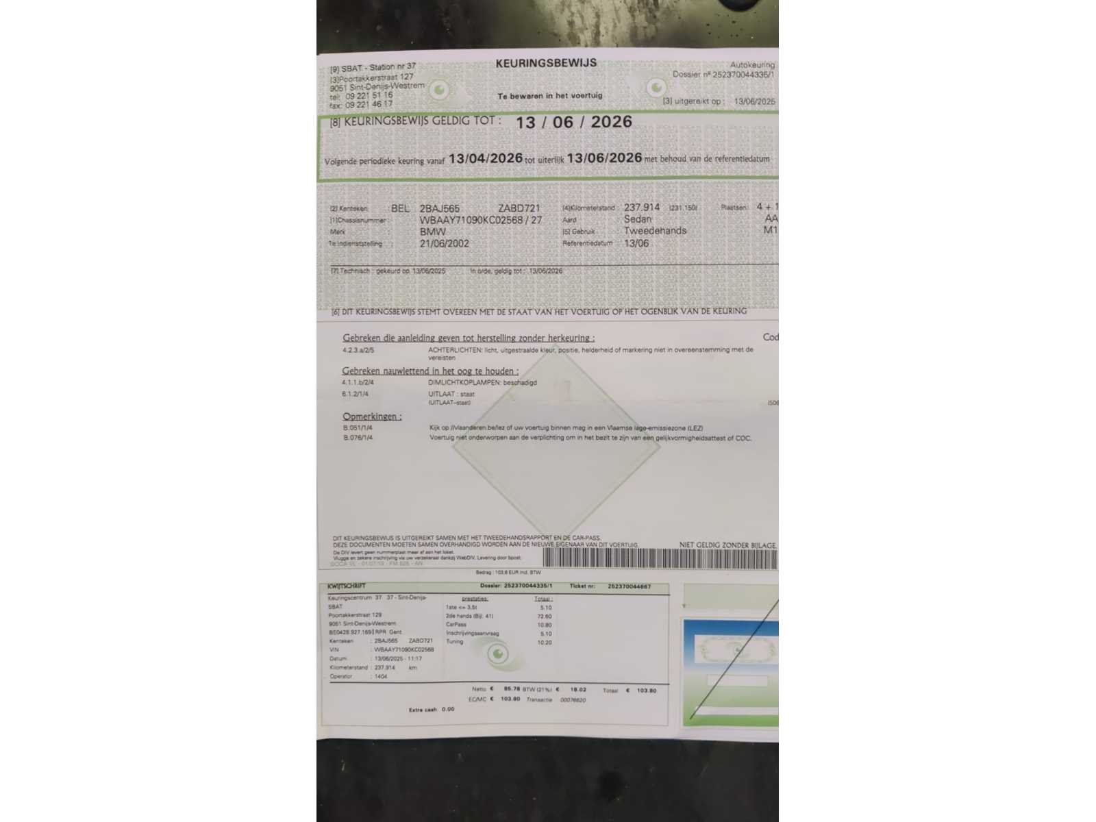 No Merk: BMW Model: 318I Type: 346L Bouwjaar: 2002 Afgelezen kilometerstand: 249146km Cilinderinhoud: 1995cc Vermogen (kW): 110kW Brandstof: Benzine Chassisnummer: WBAAY71090KC02568(01) Datum eerste toelating: 21/06/2002 Aantal zitplaatsen: 5 Kleur: Blauw Transmissie: Automaat Aantal deuren: 5 Carrosserie: Sedan Nationaliteit documenten: Belgisch startinformatie : Start en rijd Airconditioning: true Navigatie: true Inschrijvingsbewijs - deel 1 : Aanwezig Inschrijvingsbewijs - deel 2: Aanwezig