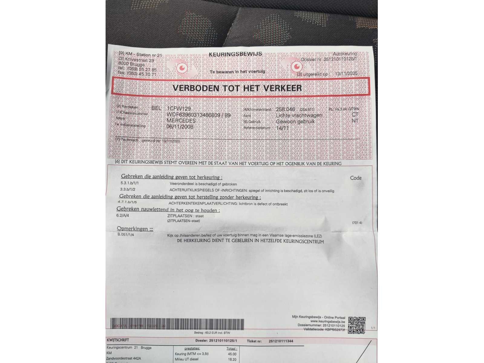 Carosserieschade, zie foto's No Merk: Mercedes Type: Vito Bouwjaar: 2008 Chassisnummer: WDF63960313486809(01) Afgelezen kilometerstand: 258064km Cilinderinhoud: 2148cc Brandstof: Diesel Datum eerste toelating: 06/11/2008 Transmissie: Handgeschakeld Aantal zitplaatsen: 3 Kleur: Wit Nationaliteit documenten: Belgisch Carrosserie: Lichte vrachtwagen Kentekenpapieren compleet?: true Boorddocumenten aanwezig?: true