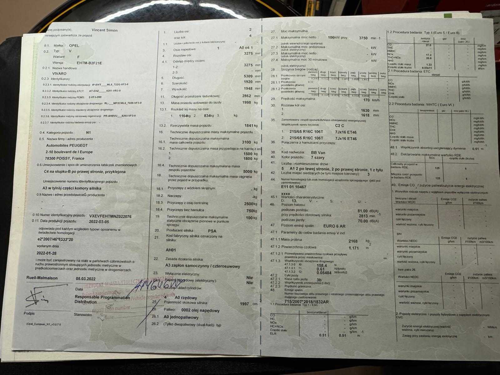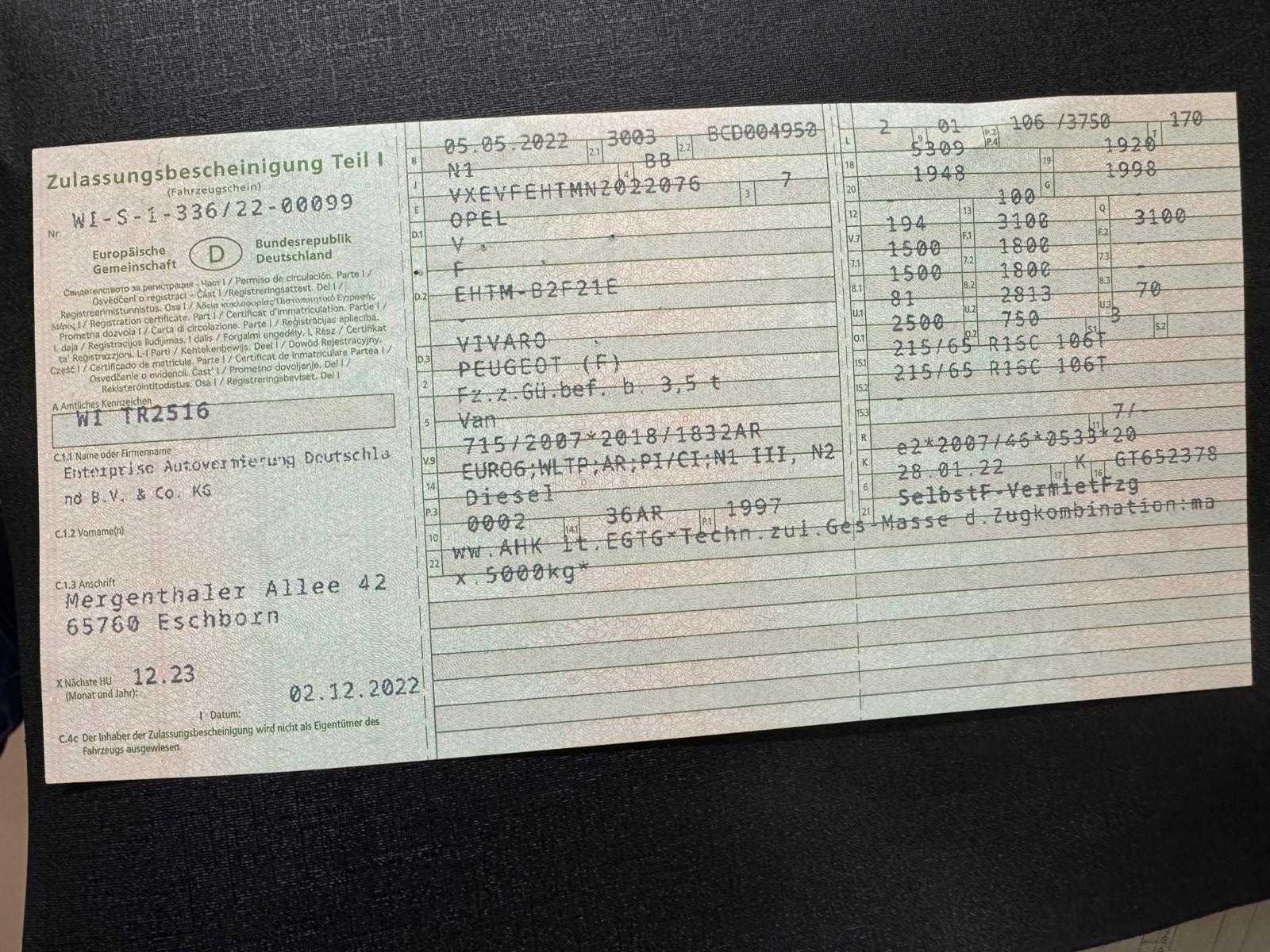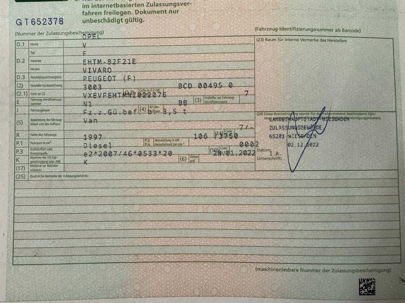 No Merk: Opel Model: Vivaro Type: F Bouwjaar: 2022 Afgelezen kilometerstand: 77974km Cilinderinhoud: 197cc Vermogen (kW): 106kW Brandstof: Diesel Chassisnummer: VXEVFEHTMNZ022076 Datum eerste toelating: 05/05/2022 Transmissie: handgeschakeld Nationaliteit documenten: Duits