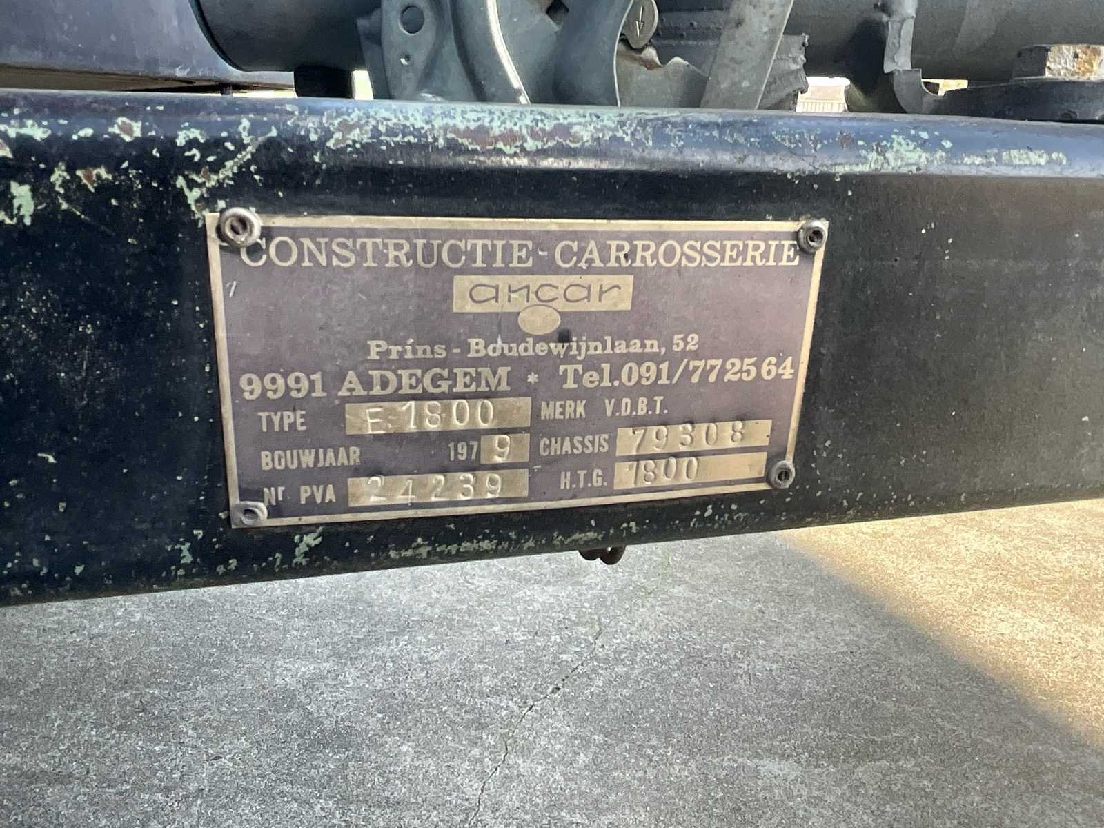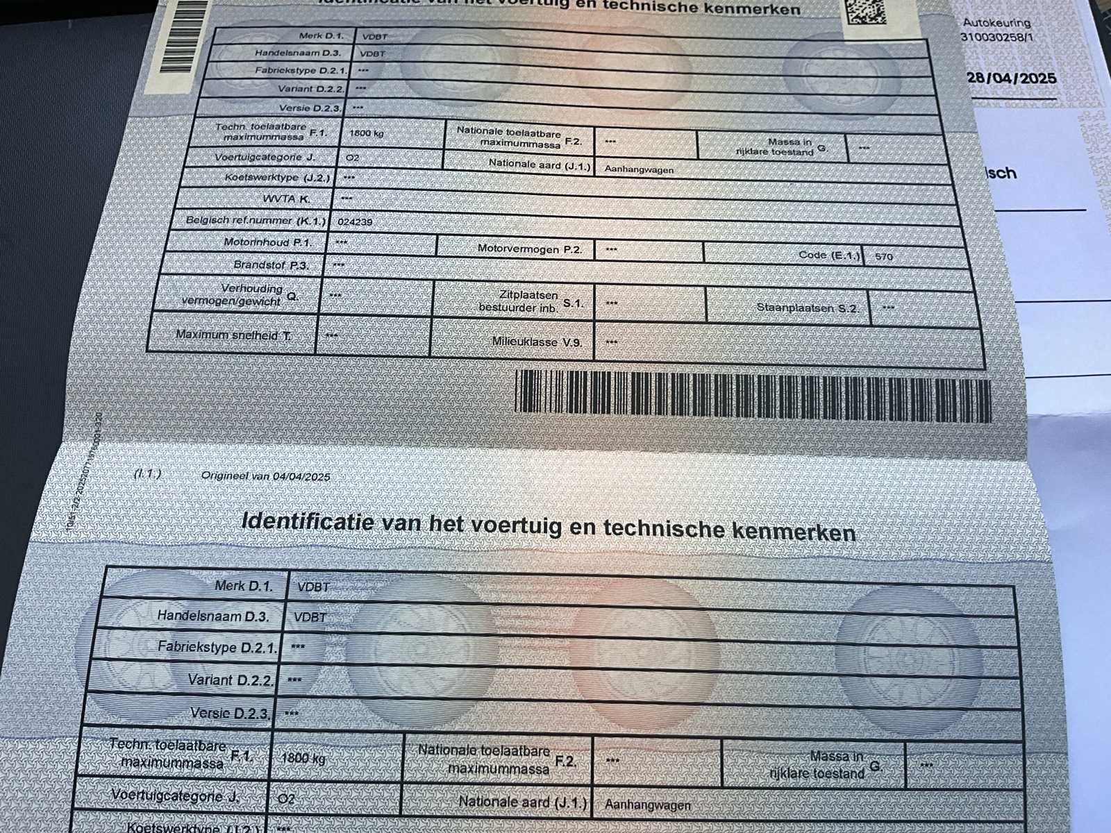 Het voertuig is een aanhangwagen (aanhangwagen AR). De merknaam van de aanhangwagen is VDBT. De carrosseriebouwer is Constructie-Carrosserie Ancar. De constructeur is gevestigd op Prins Boudewijnlaan 52, 9991 Adegem, België. Het type van de aanhangwagen is E1800 (E-1800). Het bouwjaar van de aanhangwagen is 1979. De datum van eerste inschrijving is 18/10/1979. De datum van eerste gebruik is 18/10/1979. De datum van laatste inschrijving is 04/04/2025. Het kenteken (nummerplaat) is QATQ223. Het documentnummer van het kentekenbewijs is 374509557. Het chassisnummer vermeld op documenten is 79308 / 57. Het VIN-nummer op het kentekenbewijs is 79308(02). Het PVG-nummer / Belgisch referentienummer is 024239. Het nummer PVA op het typeplaatje is 24239. Het voertuig heeft 2 assen. Het voertuig heeft geen motorassen. De ophanging van de aanhangwagen is mechanisch. De massa rijklaar (tarra) is 720 kg. De maximaal toegelaten massa (MTM) is 1800 kg. De technisch toegelaten massa is 1800 kg. De voertuigcategorie is O2 (aanhangwagen). De nationale aard van het voertuig is aanhangwagen. De code van de koppeling is 4 Bol. Het type koppeling is Winterhoff WW30D2. De identificatiekeuring werd uitgevoerd door SBAT Autokeuring, Industrieweg 2, 9032 Wondelgem. Het dossiernummer van de keuring is 252310030258/1. Het identificatieverslag werd geregistreerd op 28/04/2025. Het stationnummer van de keuringsinstantie is 31. De originele gelijkvormigheidsattest-verklaring werd opgesteld op 16/10/1979 in Adegem. Nee Merk: VDBT Model: E1800 Chassisnummer: 79308 / 57. Kleur: zwart-wit Gewicht: 720kg No self drive export!: true Nationaliteit documenten: Belg Bouwjaar: 1979