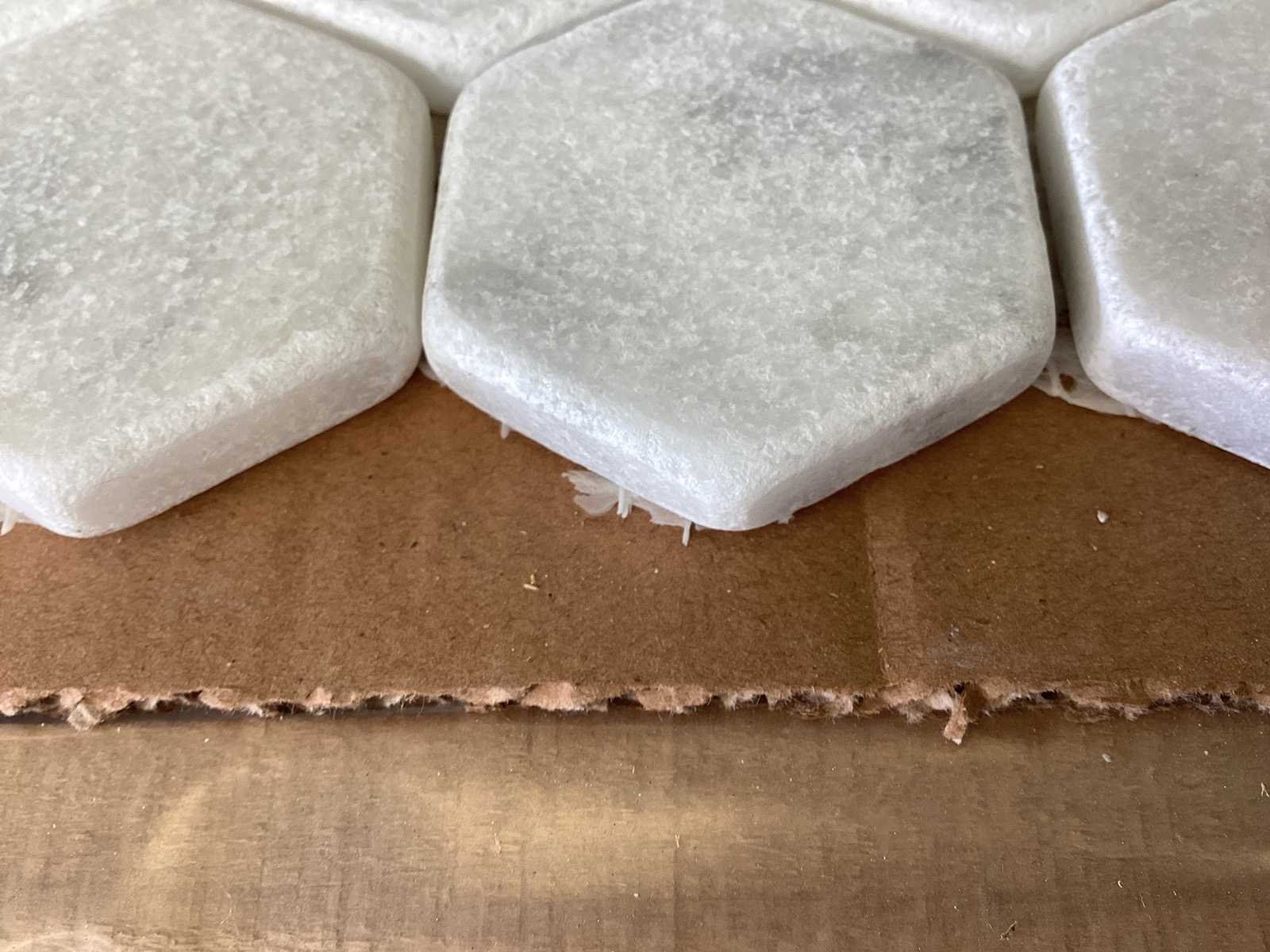 Totaal 120 KG No Merk: Natuursteen Kleur: Wit Afwerking: Mat Getrommeld Lengte: 28cm Breedte: 33.5cm Materiaal: Marmer Dikte: 10mm Type: Mozaïektegel Model: Hexagon 5x5 cm Aantal m² per verpakking: 0.0938m² Aantal pakken: 50 Totaal oppervlakte: 4.69m²