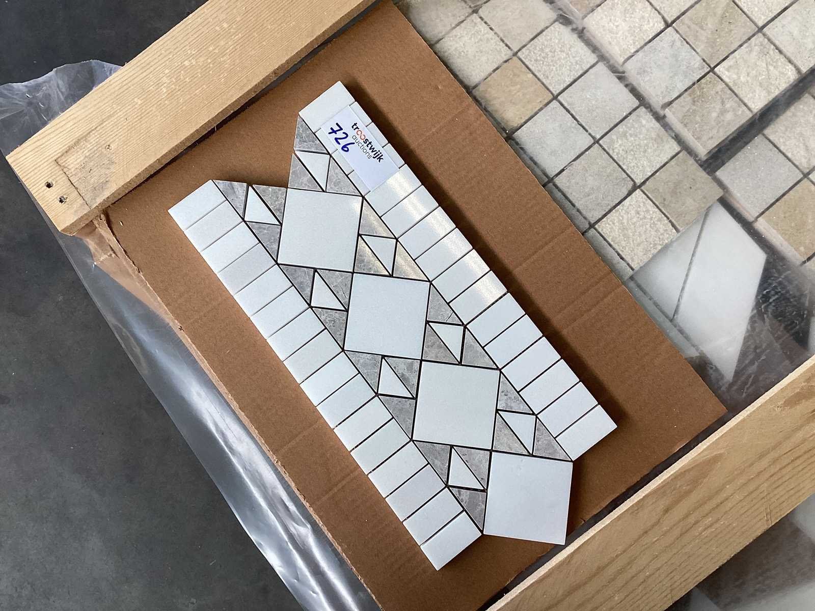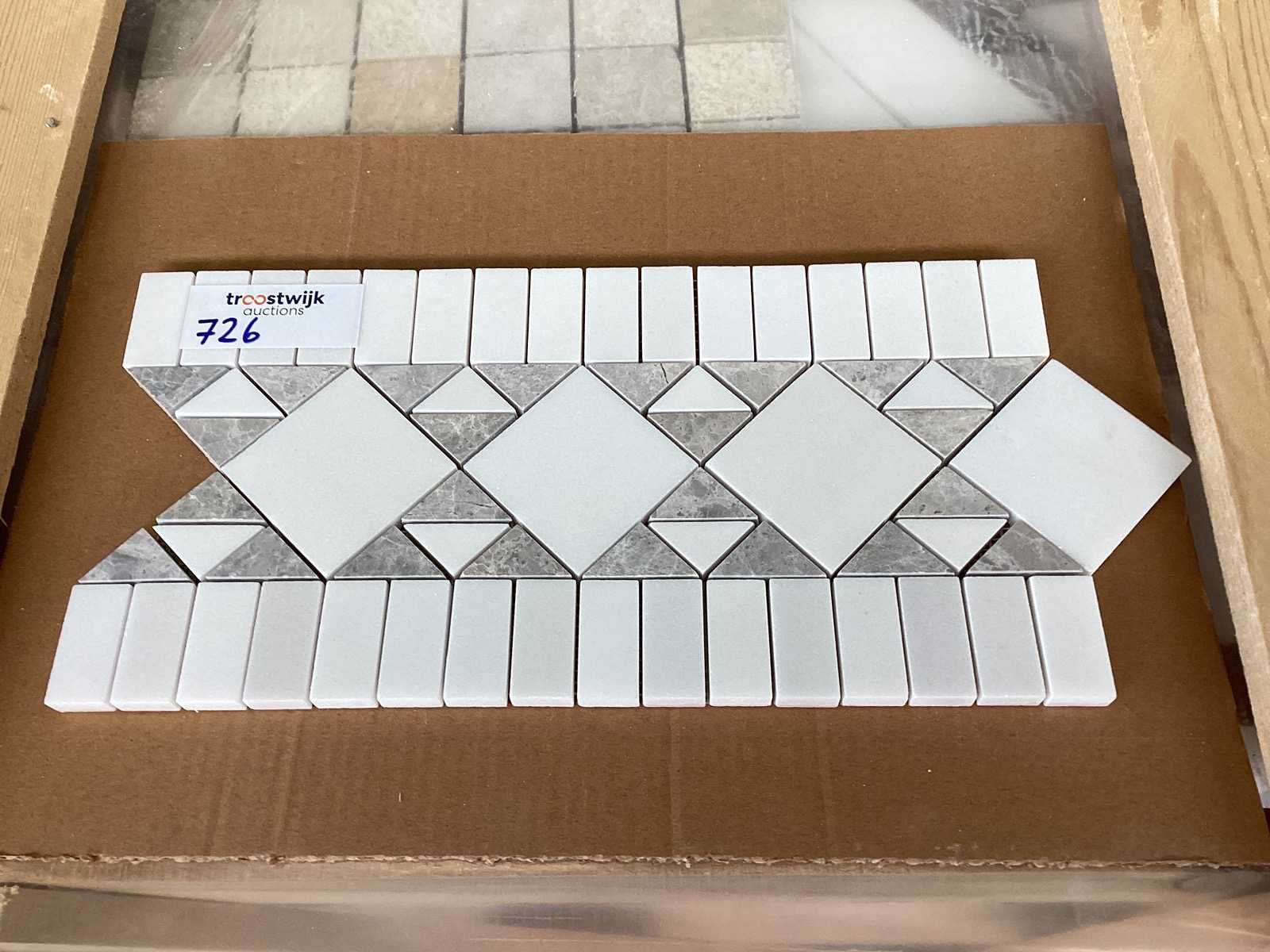 Totaal 80 KG No Merk: Natuursteen Kleur: Grijs/Wit Mix Afwerking: Mat Getrommeld Lengte: 36cm Breedte: 18cm Materiaal: Marmer Dikte: 10mm Type: Mozaïektegel Aantal m² per verpakking: 0,0648m² Aantal pakken: 50 Totaal oppervlakte: 3.24m²