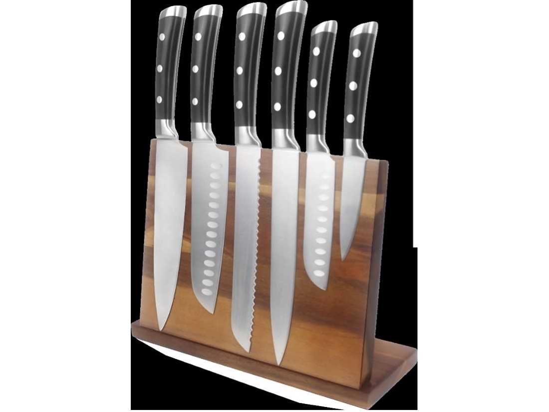 7-delige kinfe set: Koksmes 8” (2,5mm) Santoku mes 7"(2.5mm) Broodmes 2,5 mm Snijmes 2,5 mm Officemes 5"(2.0mm) Vouwmes 3” (2.0mm) Magnetisme messenhouder No