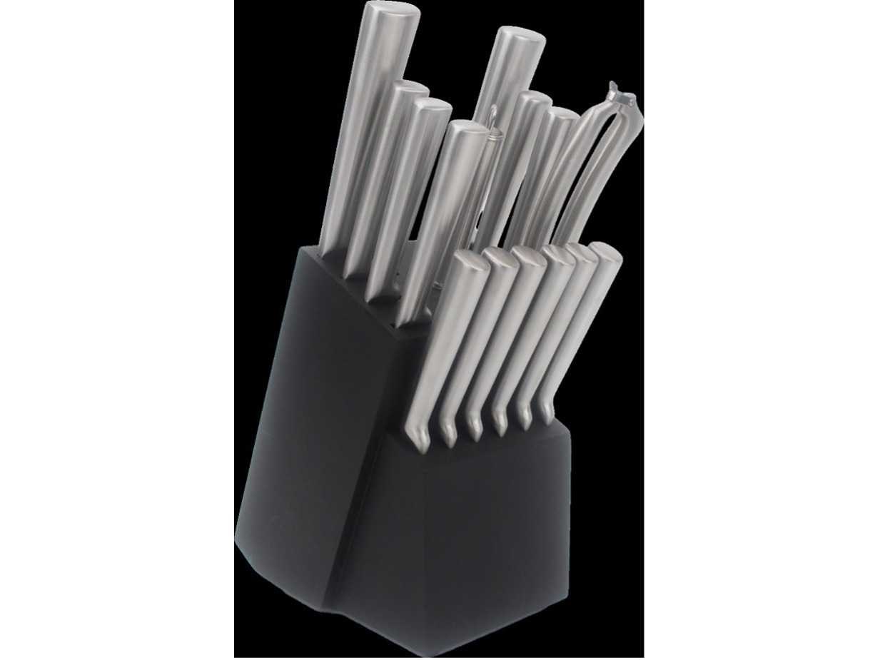 15-delige messenset: koksmes 8"(2,5mm) broodmes 7"(2.5mm) Snijmes 8"(2.5mm) Officemes 5"(2.0mm) schilmesje 3” (2.0mm) steakmes 5” (2.0mm) Puntenslijper 7.5” kippenbotschaar houtblok No