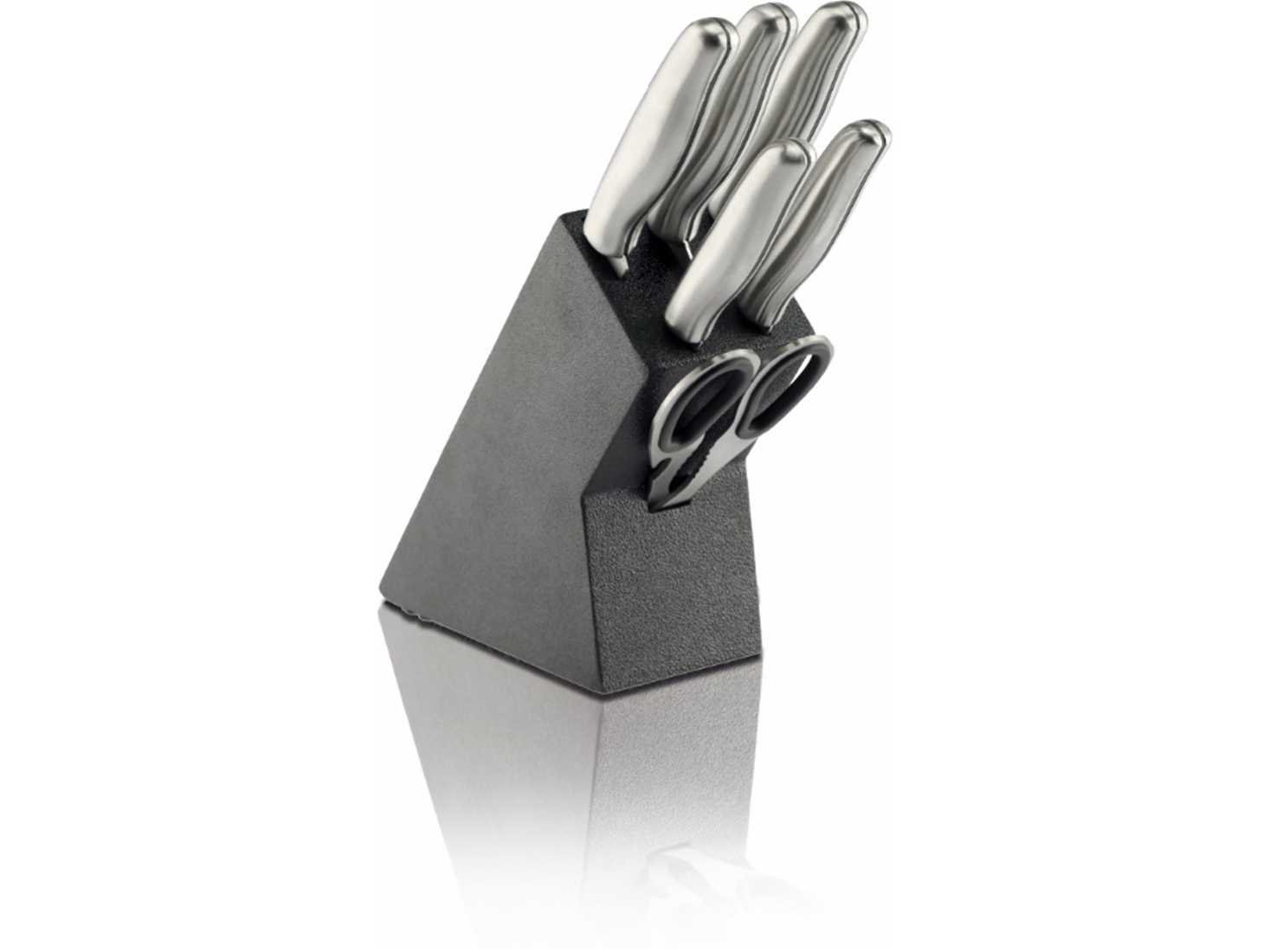 6-delige messenset : Koksmes 8"(1.5mm ) Broodmes 8"(1.5mm) Snijmes 8 “(1.5mm) Officemes 5 “(1.2mm) Vouwmes 3” (1.2mm) Messenstandaard No