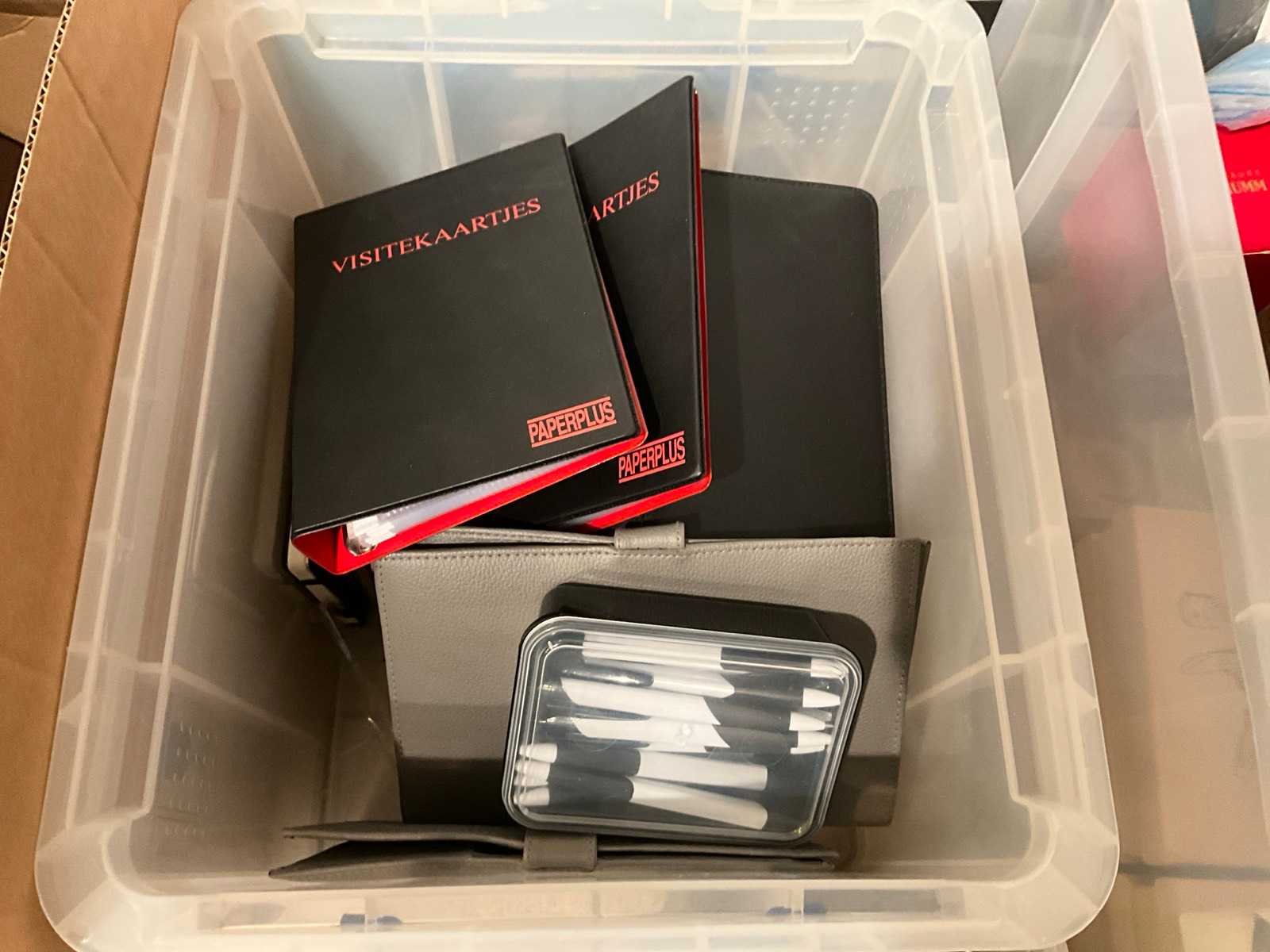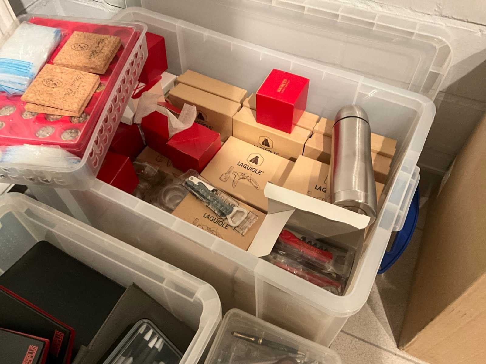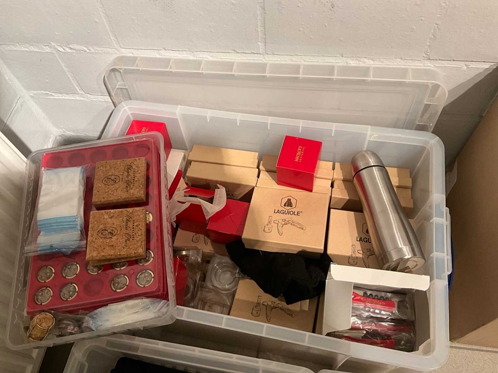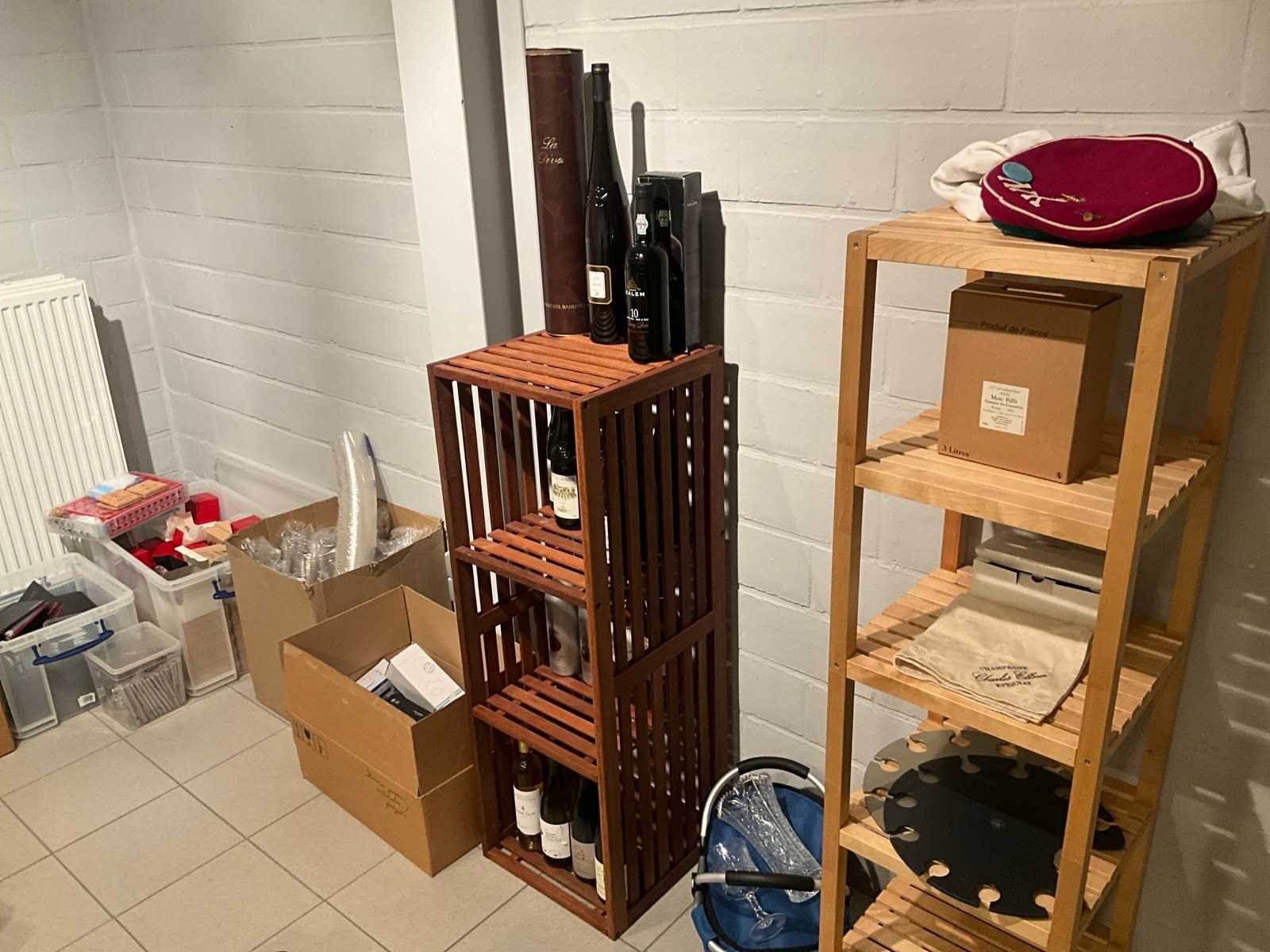 Waaronder 17fl diverse wijnen, 2 houten opbergrekken, diverse glazen, geschenkartikelen, wegwerpbekers, kurkentrekkers, diverse Balmain balpennen, enige kantoorartikelen Nee