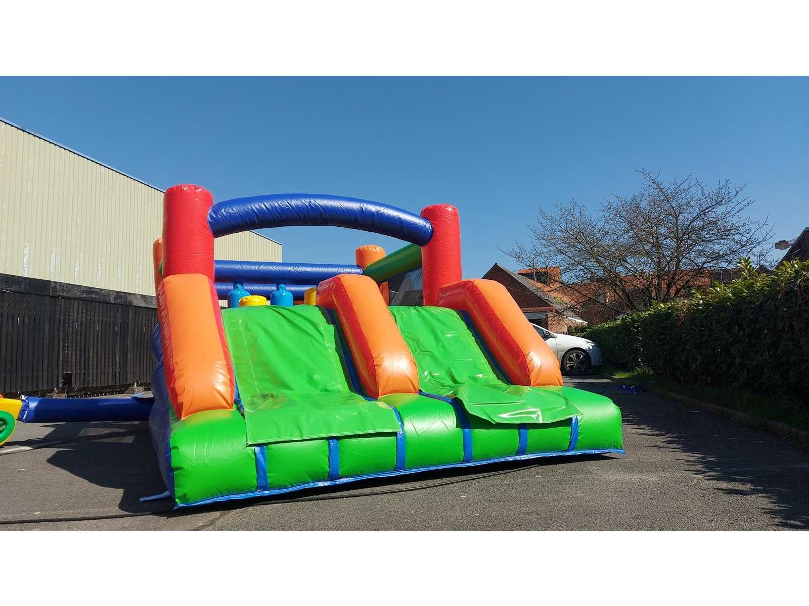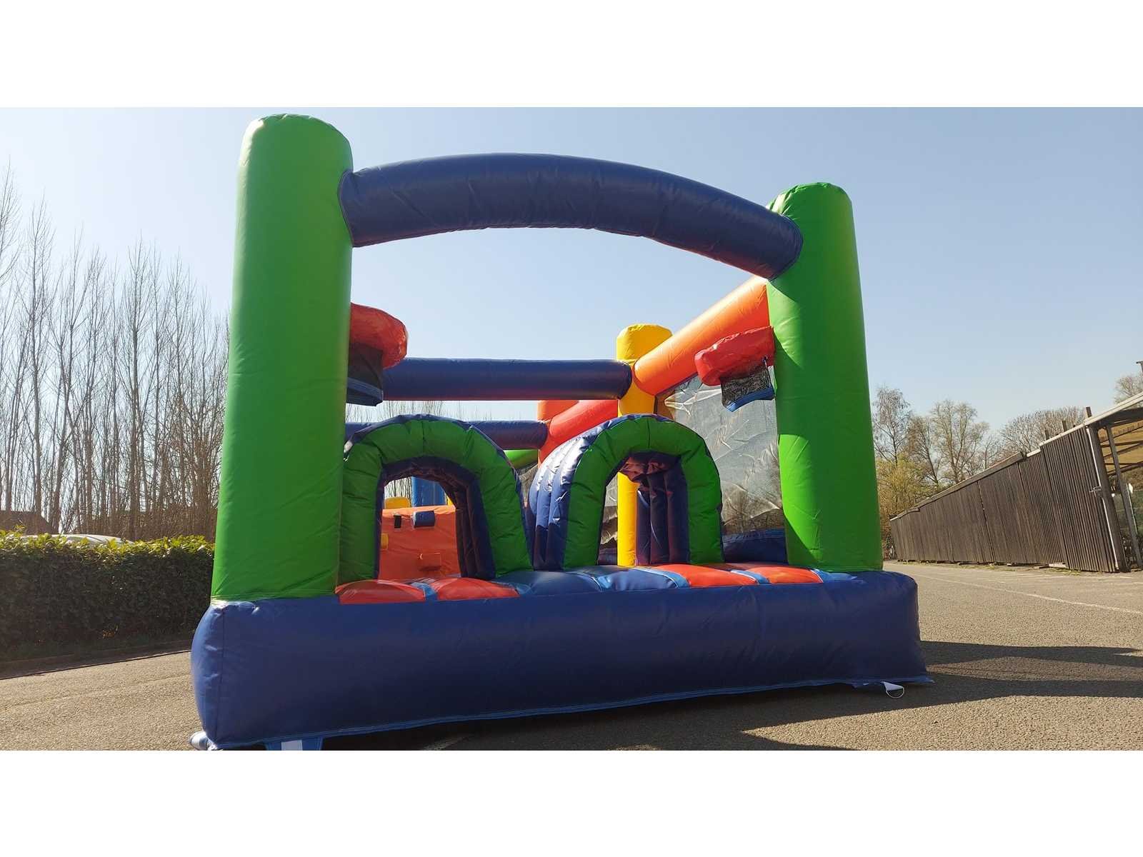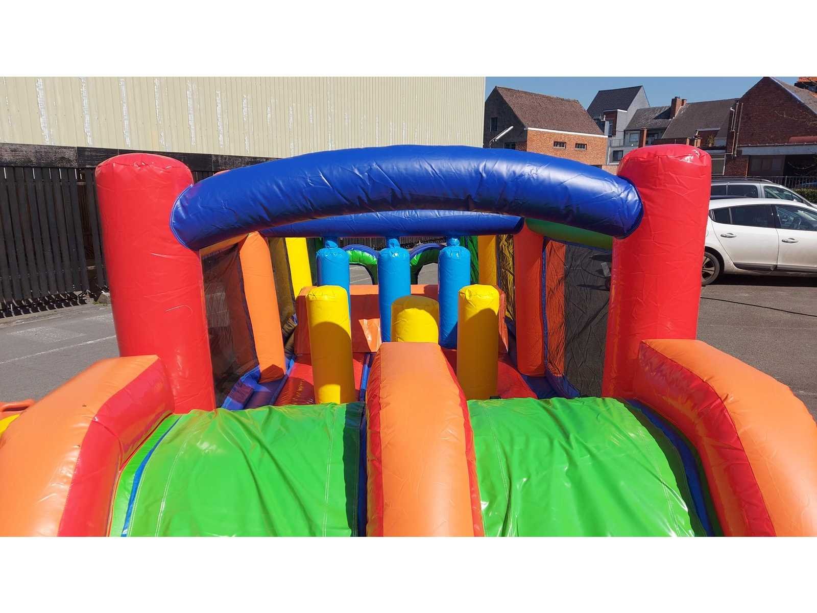 Hindernisparcours in verpakking, afmetingen verpakking in cm: 90x90x100. EN14960 Nee Gewicht: 90kg Lengte: 760cm Breedte: 250cm Hoogte: 220cm Materiaal: PVC 0,55 tarpaulin