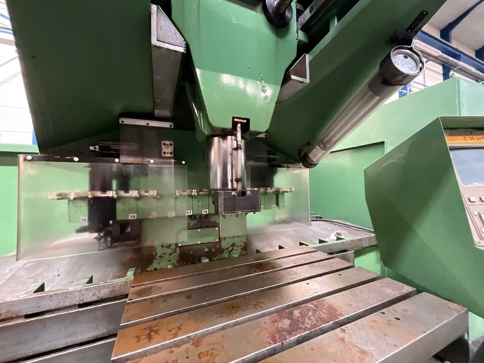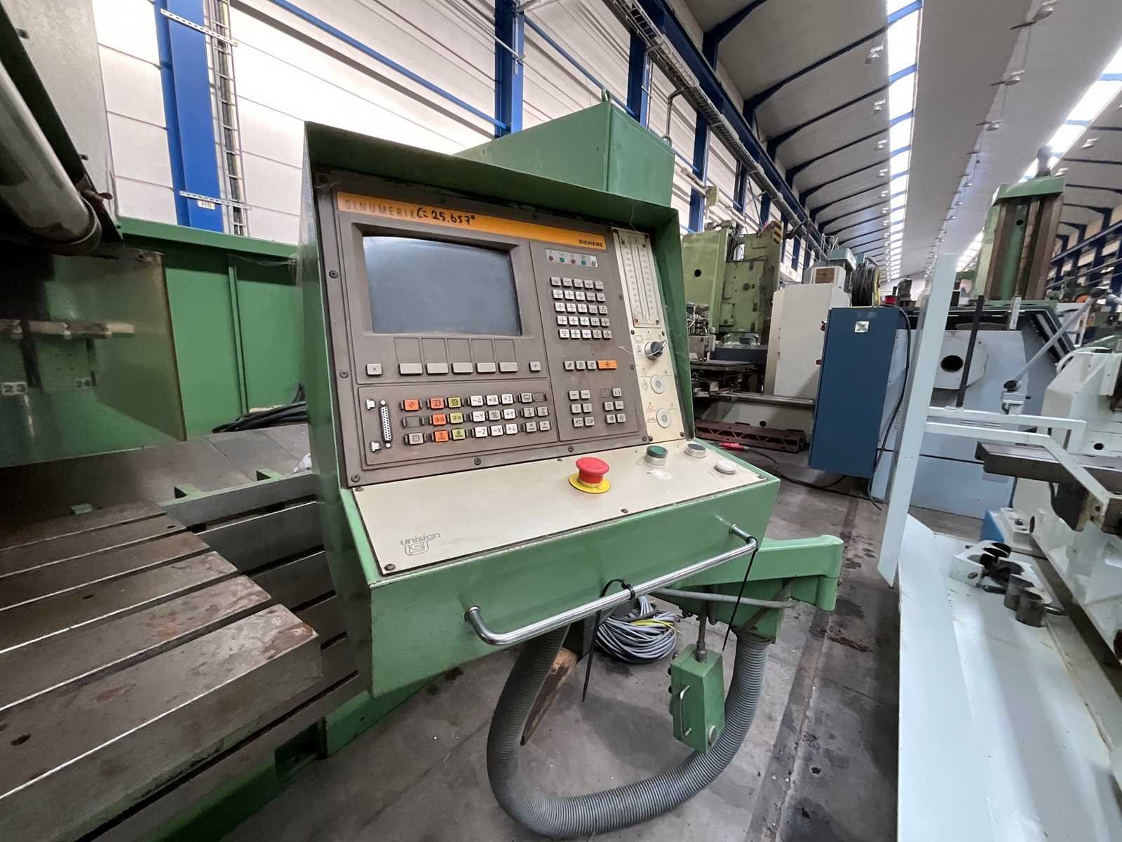 CNC – Vert. Machining Centre Inv. No. 10.653MM Make UNISIGN Model Univers 4 Control Siemens Sinumerik 810D Travel X (Longitidinal) 1.600 mm Y (Cross) 400 mm Z (Spindle Height) 400 mm Taper ISO 40 Table 700 x 400 mm Load 600 kg Distance Spindle Nose to Table 150-550 mm R.P.M. 9.000 Main spindle kW 14 Rapid Traverse X,Y,Z 5-28.000 mm/min. Feedrate X,Y,Z 28.000 mm/min. A.T.C. 44 pos. Nee Merk: UNISIGN Type: UNIVERS 4 Verplaatsing x-as: 1600mm Verplaatsing y-as: 400mm Verplaatsing z-as: 400mm Opname: ISO 40 Snelheid van n =: 0rpm Snelheid tot n =: 9000rpm Tafel afmeting l: 700mm Tafel afmeting b: 400mm Werkstuk gewicht max.: 600kg CNC-besturing, merk, type: SIEMENS SINUMERIK 810D Motorvermogen (kW): 14kW Aansluiting: 380V Afmeting l: 3300mm Afmeting b: 220mm Afmeting h: 3000mm GS Code: 84571090 Leveringsvoorwaarden: Geladen op vrachtwagen