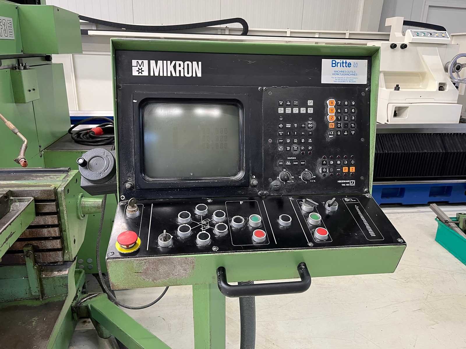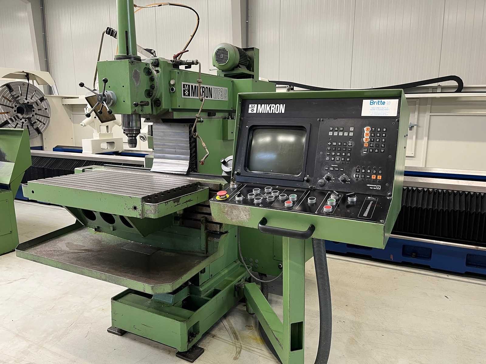 CNC UNIVERSAL MILLING MACHINE Inv. No. 13.165J1 Make MIKRON Model WF 31DCM Machine No. Control HEIDENHAIN TNC 155 Table dimensions 460 x 800 mm Longitudinal travel (X) 560 mm Cross travel(Y) 500 mm Vertical travel (Z) 400 mm R.P.M. 40 – 4000 Rapid traverse X-Y 4000 mm/min Rapid traverse Z 3500 mm/min Quill travel 90 mm kW total power 10 kW drive power 3,3 / 4 Machine weight 2540 kg Nee Merk: MIKRON Type: WF31DCM Verplaatsing x-as: 560mm Verplaatsing y-as: 500mm Verplaatsing z-as: 400mm Snelheid van n =: 40rpm Snelheid tot n =: 4000rpm T-gleuf opspantafelafmeting L: 800mm T-gleuf opspantafelafmeting B: 460mm CNC-besturing, merk, type: HEIDENHAIN TNC 155 Motorvermogen (kW): 10kW Machinegewicht: 2540kg GS Code: 84596110 Leveringsvoorwaarden: Geladen op vrachtwagen
