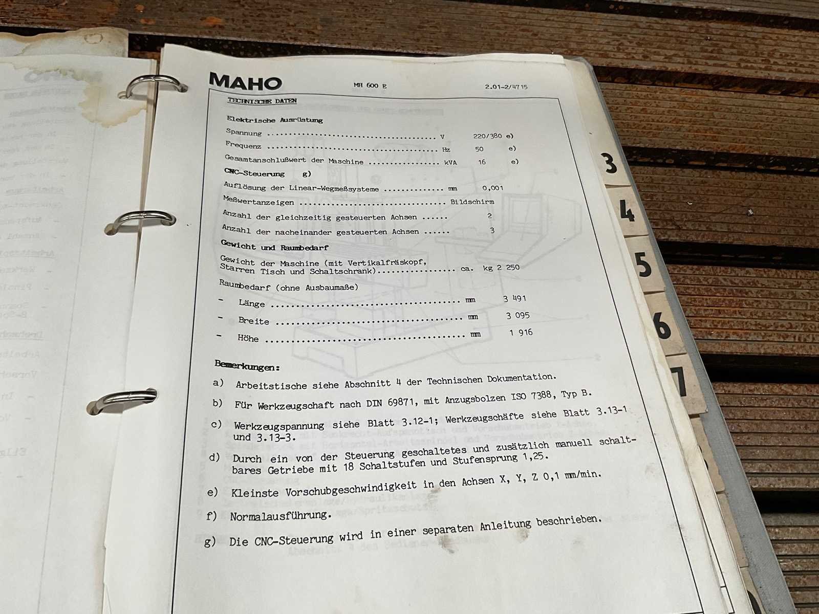 Nee Merk: MAHO Type: MH600T Serienummer: 64449 Verplaatsing x-as: 600mm Verplaatsing y-as: 400mm Verplaatsing z-as: 400mm Opname iso: 40 Snelheid van n =: 80rpm Snelheid tot n =: 4000rpm T-gleuf opspantafelafmeting L: 900mm T-gleuf opspantafelafmeting B: 460mm Koelmiddelpomp: true CNC-besturing, merk, type: Heidenhain GS Code: 84596110 Leveringsvoorwaarden: Geladen op vrachtwagen