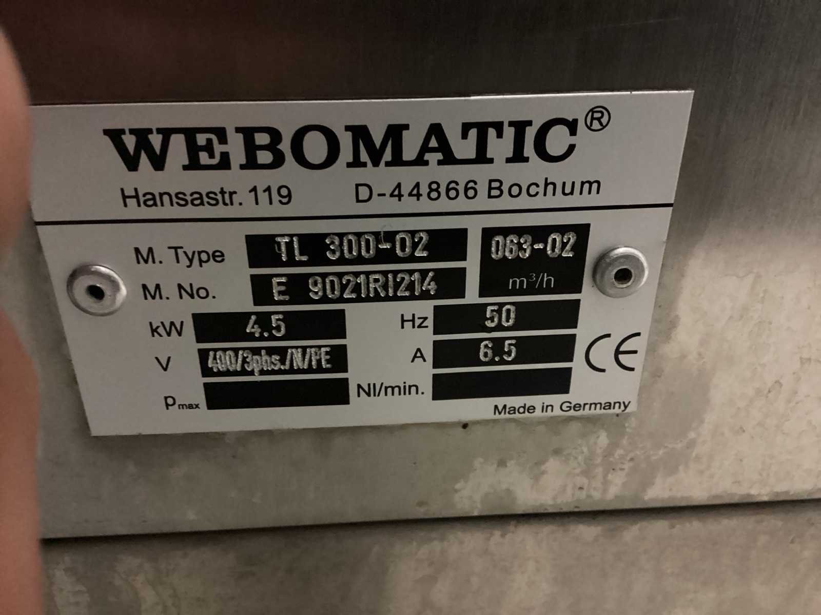 Na te kijken / werking onbekend No Merk: WEBOMATIC Type: TL300-O2 Serienummer: E9021RI214 Aansluiting: 400V Totale afmeting L: 800mm Totale afmeting Breedte: 1000mm Totale afmeting Hoogte: 1600mm