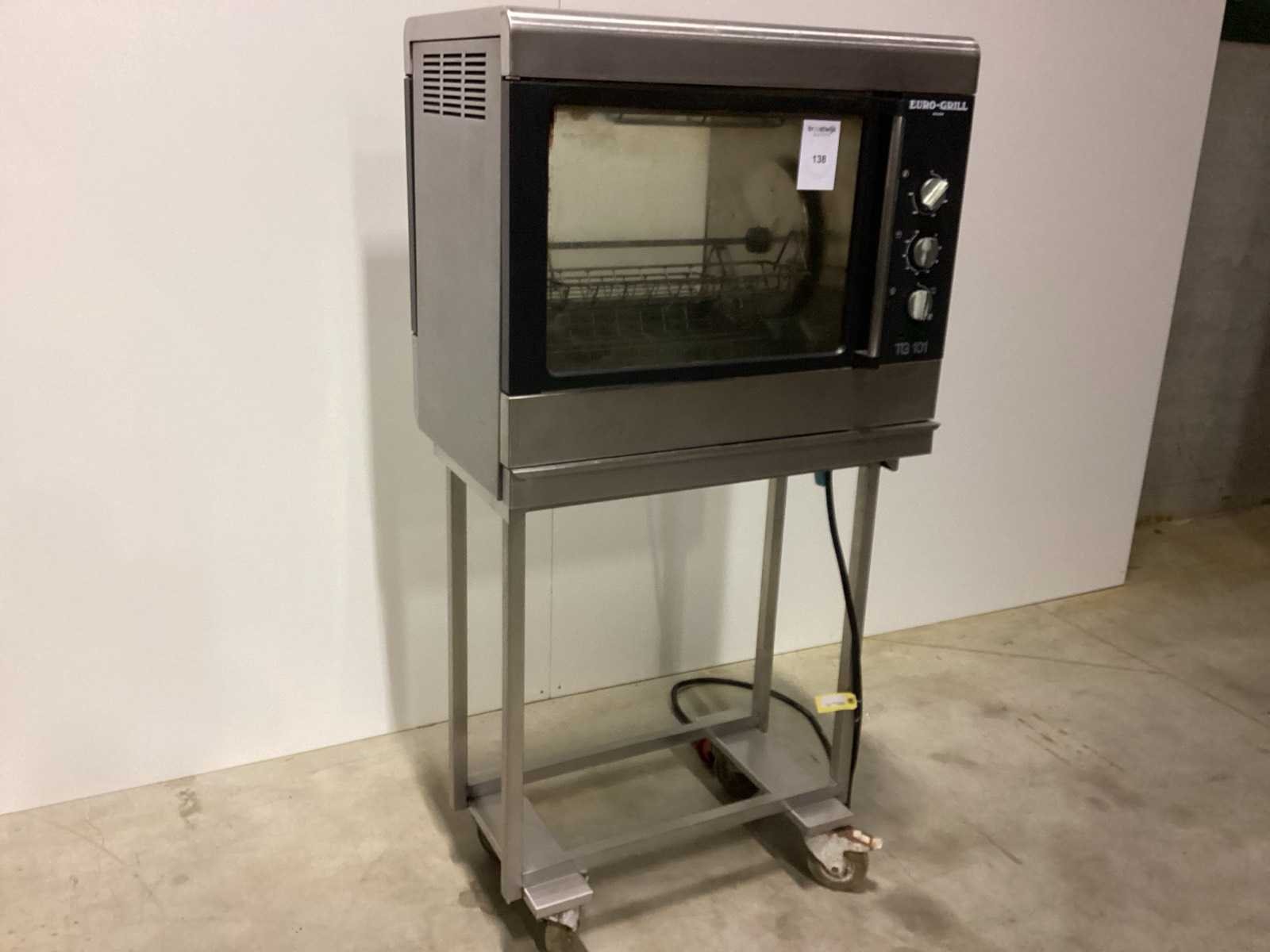 Na te kijken / werking onbekend No Merk: EURO-GRILL KIPPENSPIT Type: TG 101 met mandjes Elektrisch verwarmd: true Aansluiting: 400V Totale afmeting L: 850mm Totale afmeting Breedte: 600mm Totale afmeting Hoogte: 1700mm