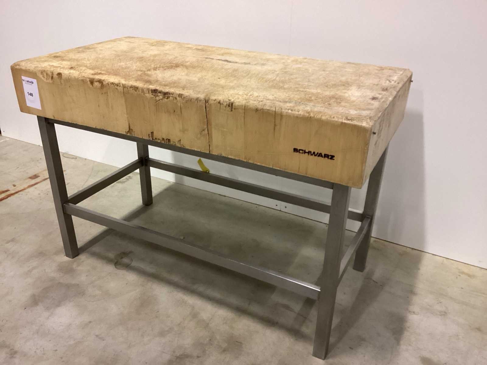 Gebruikt No Type: HOUTEN HAKBLOK OP INOX ONDERSTEL Totale afmeting L: 1200mm Totale afmeting Breedte: 600mm Totale afmeting Hoogte: 900mm