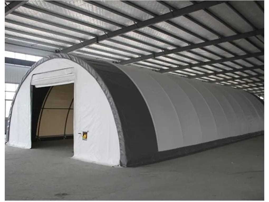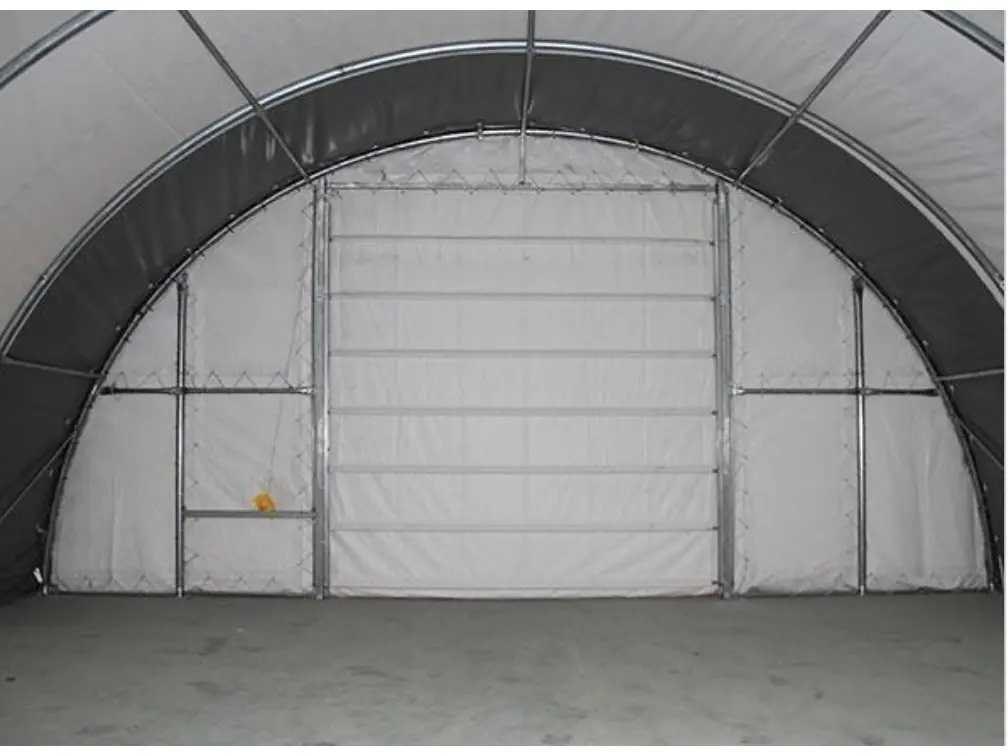 Eversteel Opslag tent/Storage Building, afmeting: 18 x 12 x 6,1 mtr, 1900 kg, gegalvaniseerde buizen, met oprolbare deur (maat: 4 x 4,5 mtr) verpakt in 2 ijzeren kratten. No