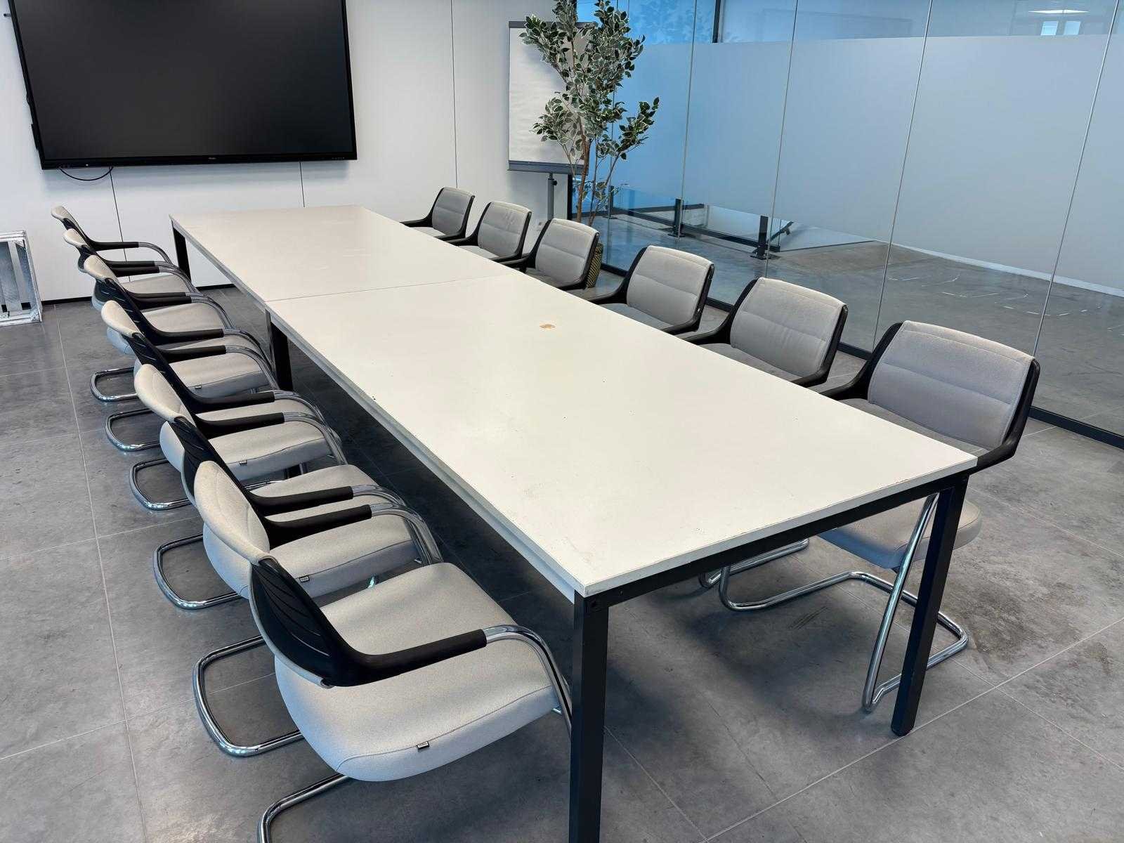 2x vergadertafel van 200cm x 100 cm 12x vergaderstoelen merk Sedus Nee Merk: Sedus Kleur: grijs/wit/zwart Lengte: 400cm Breedte: 100cm Leveringsvoorwaarden: Niet gefundeerd - onverpakt