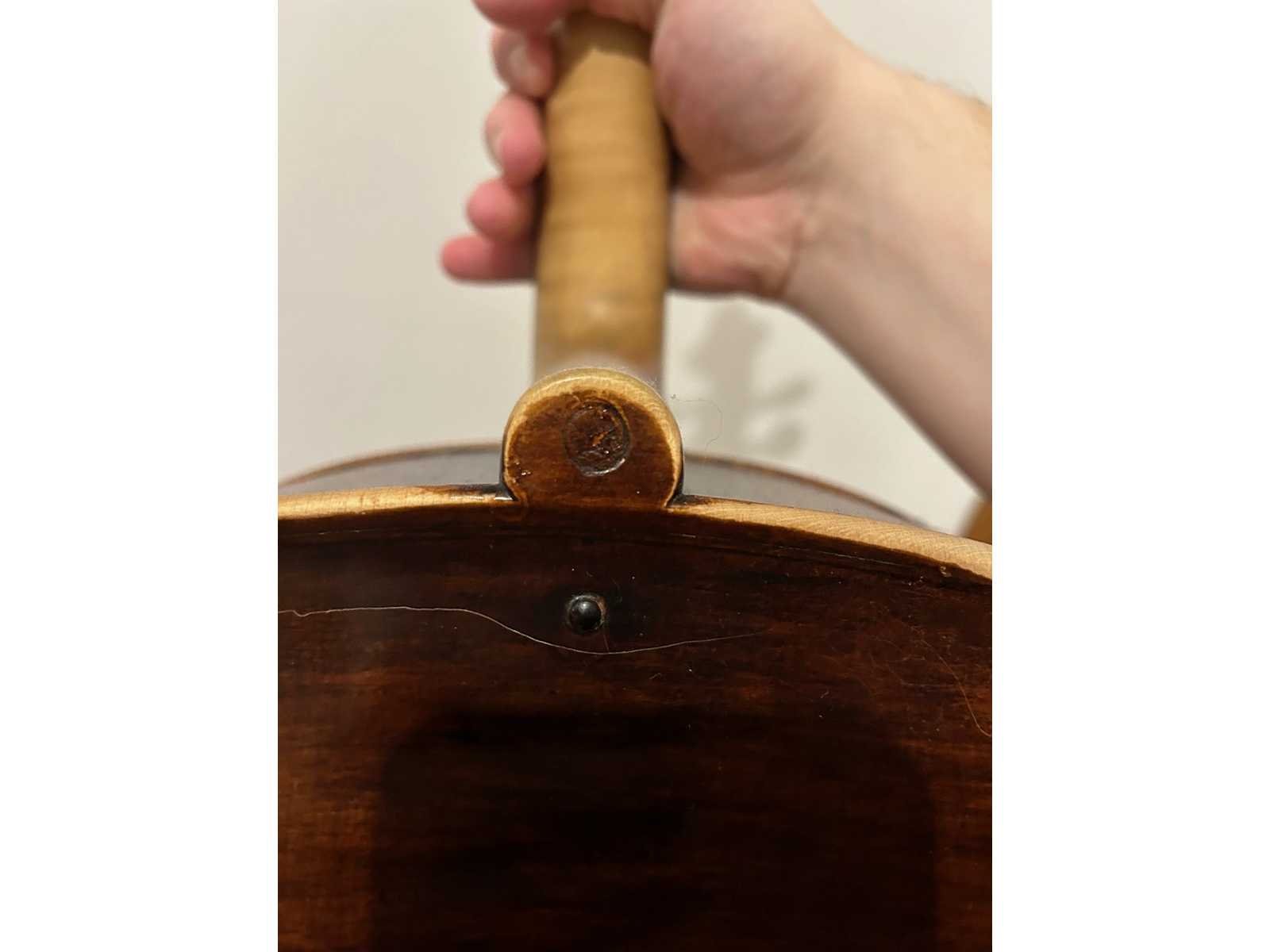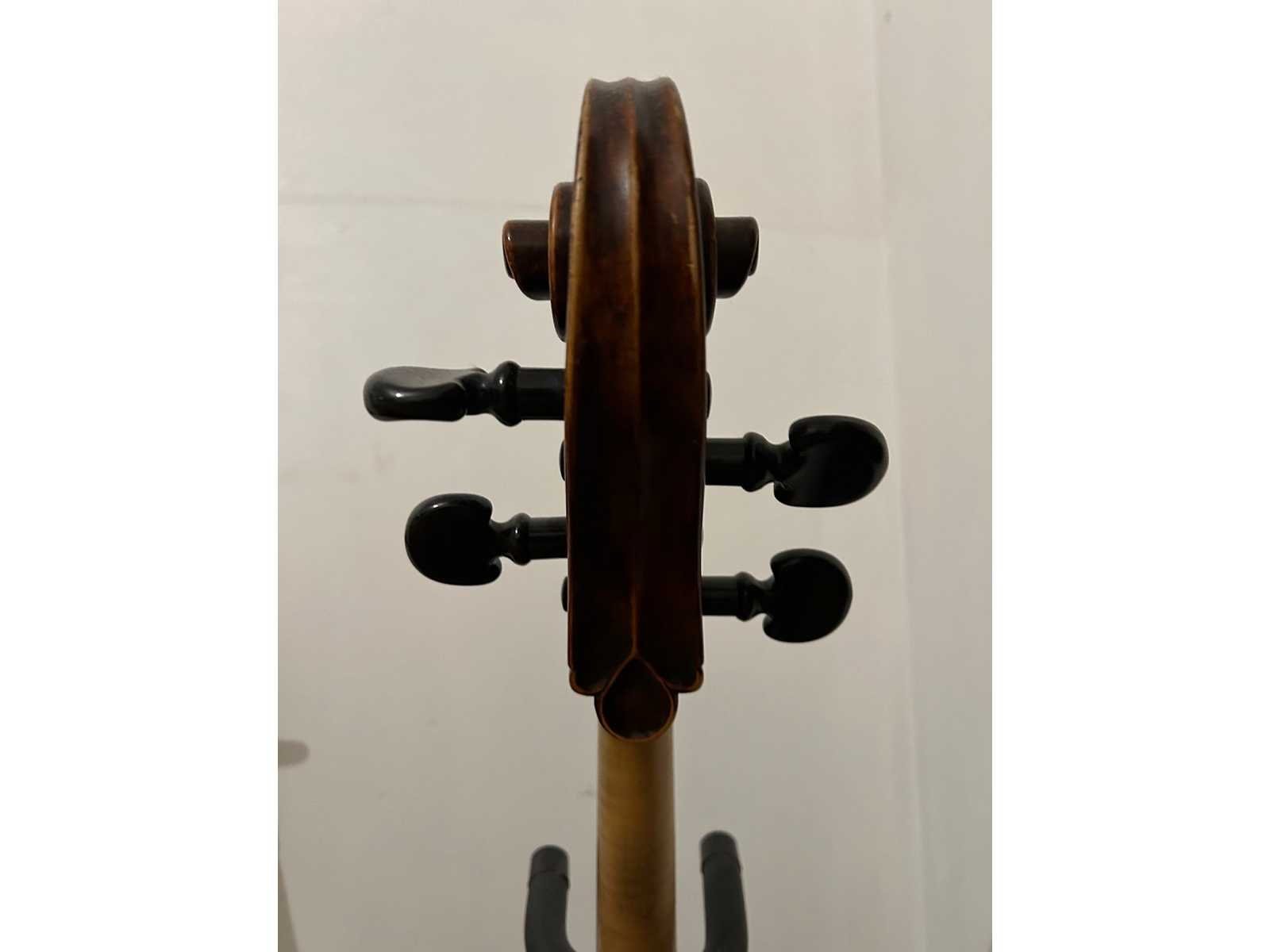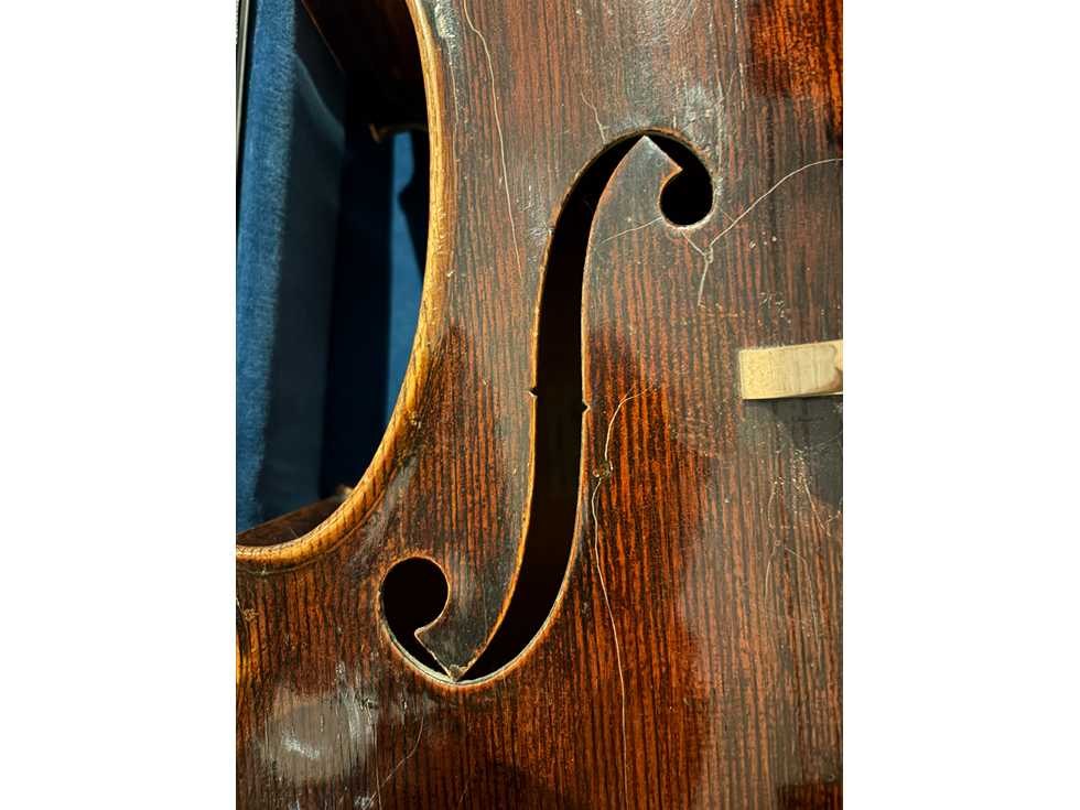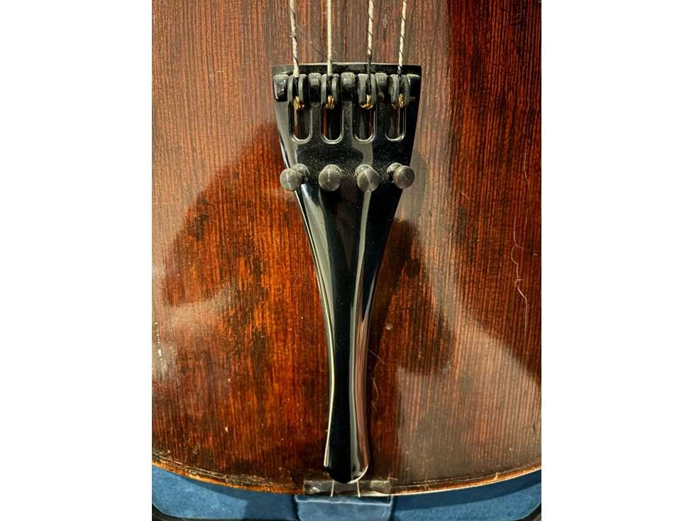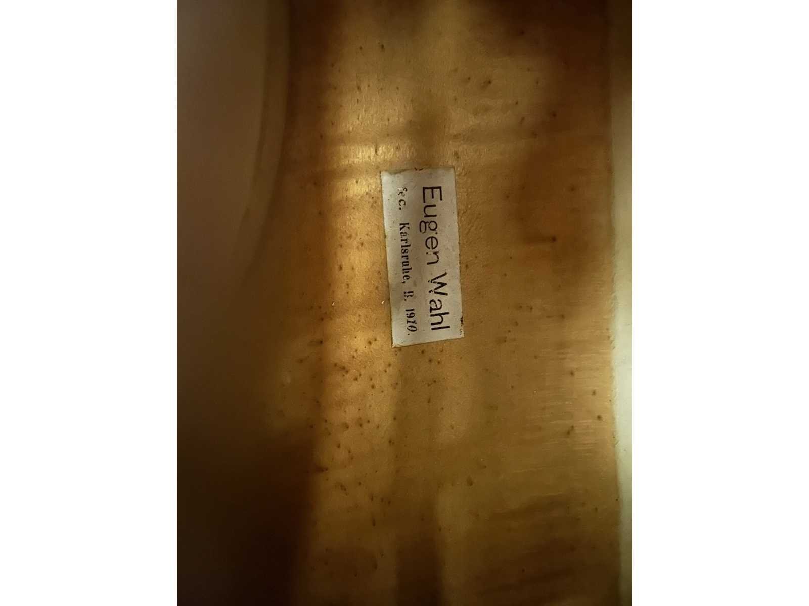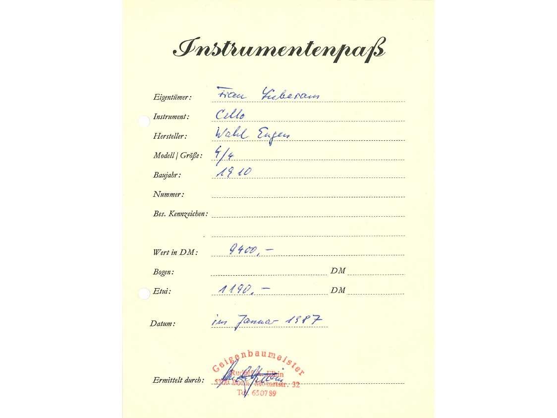 Duitse cello (maat 4/4) gemaakt door Eugen Wahl (1910). Gelabeled "Eugen Wahl fec. Karlsruhe, B. 1910" en gebrandmerkt met de initialen "EW" onderaan de hals. Donkerbruin qua kleur, LOB 768mm. Instrument is in zeer goede staat. Geen barsten aanwezig. Enkele krassen in de vernislaag, maar gezien de leeftijd is dit normaal. Wordt verzonden in een houten koffer (Azuurblauw). Instrument werd aangekocht in 1987 for 9400 DEM (+/- 4.800€). Originele aankoopbewijs is aanwezig. In 2018 werd de cello mondeling getaxeerd door een Belgische vioolbouwer op 9.500€. Nee Lengte: 76,8cm Lage schatting: 9500 Hoge schatting: 12500