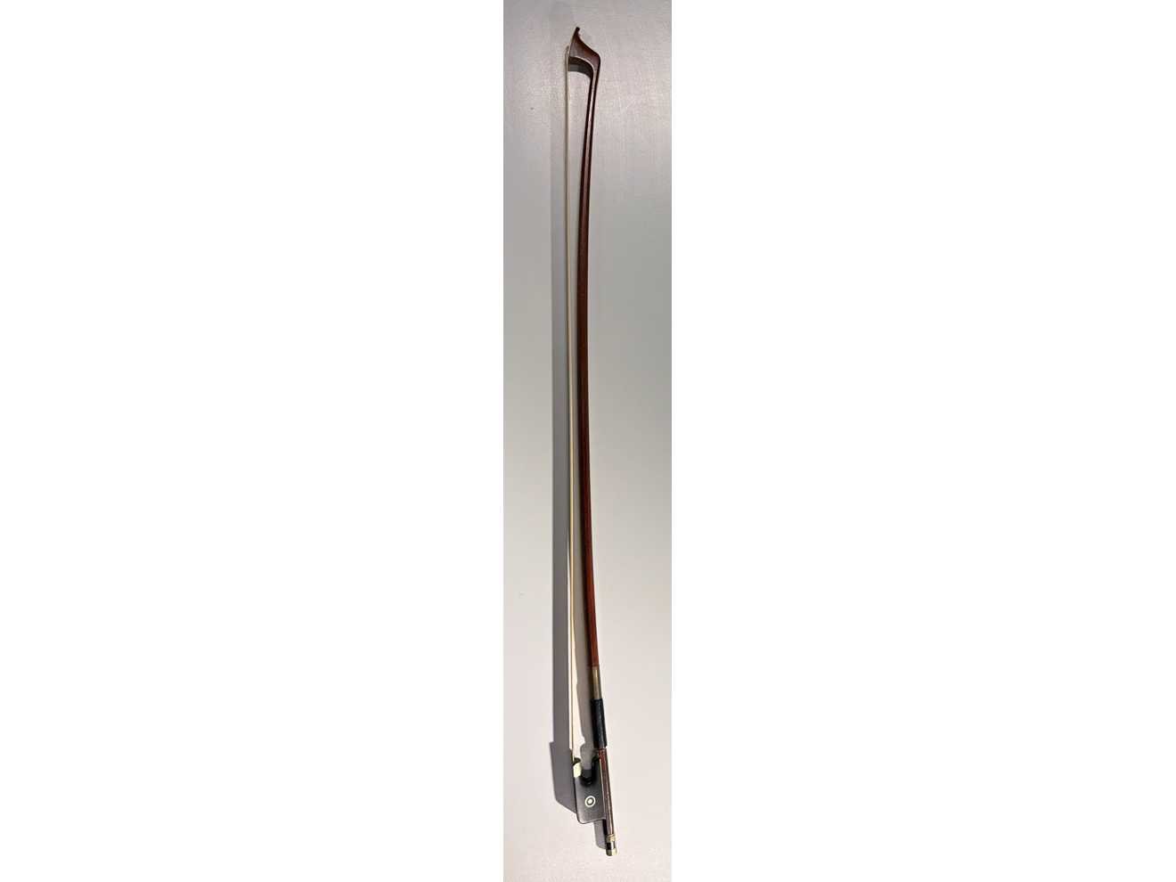 4/4 Celloboog. Nickel gemonteerd. Voorzien van een stempel op de boog, maar is moeilijk leesbaar. Eindigt op (****ZNER) Nee Lengte: 72cm Lage schatting: 500 Hoge schatting: 1200