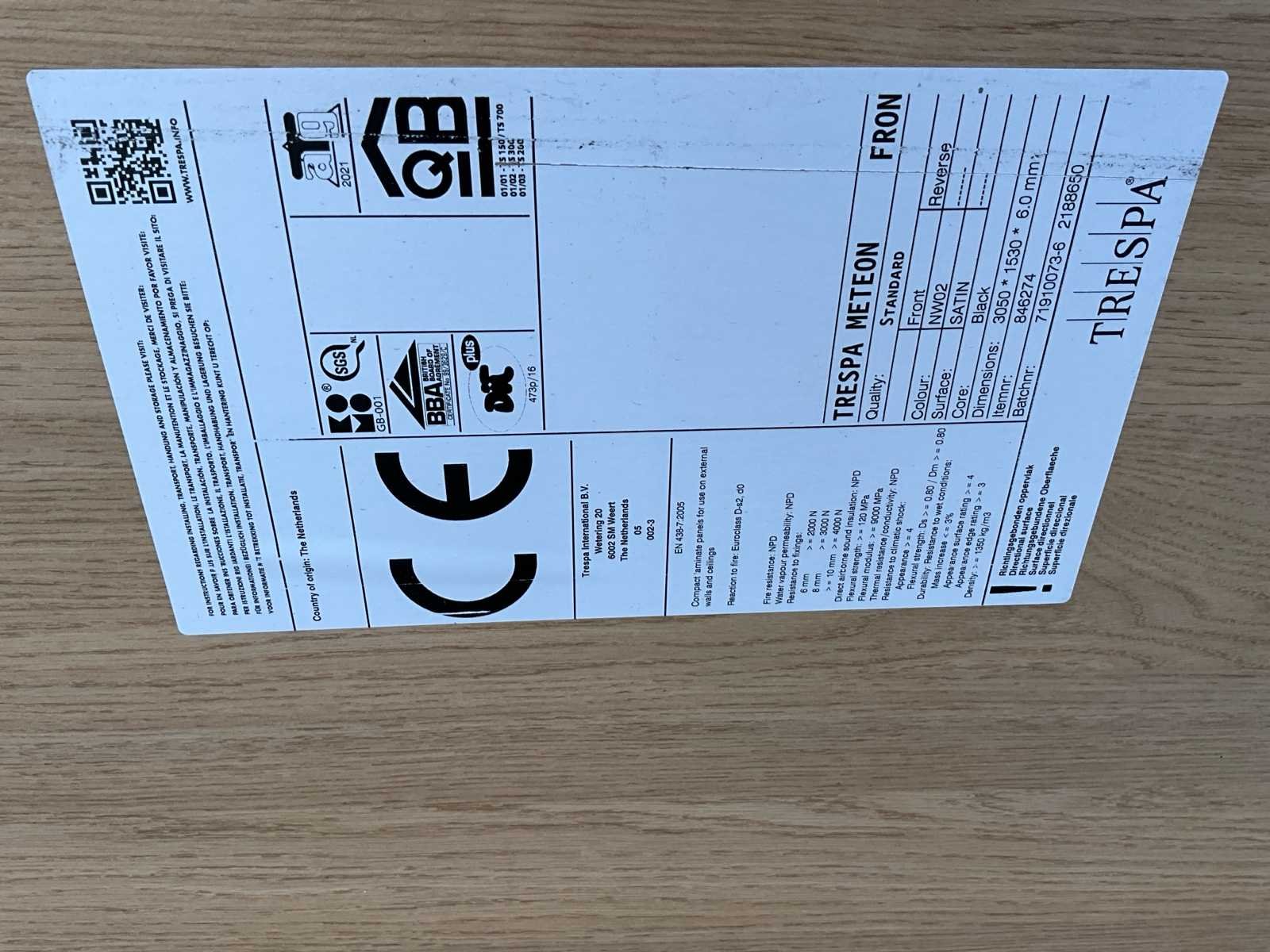 1stuk 195x81.5x0.5 5stuks lengte +- 255x75.5x0.5 Nee Merk: Trespa Type: Meteon