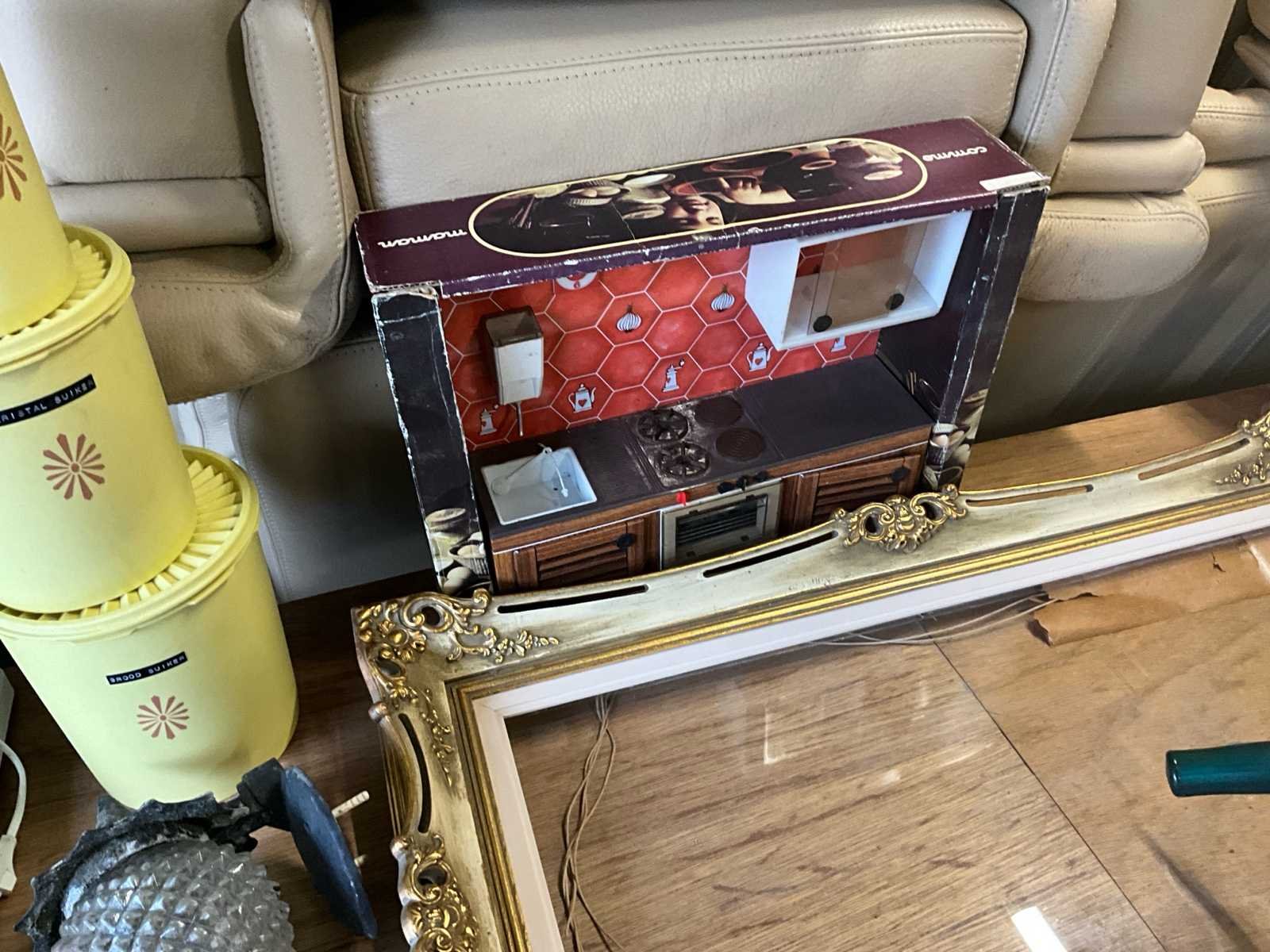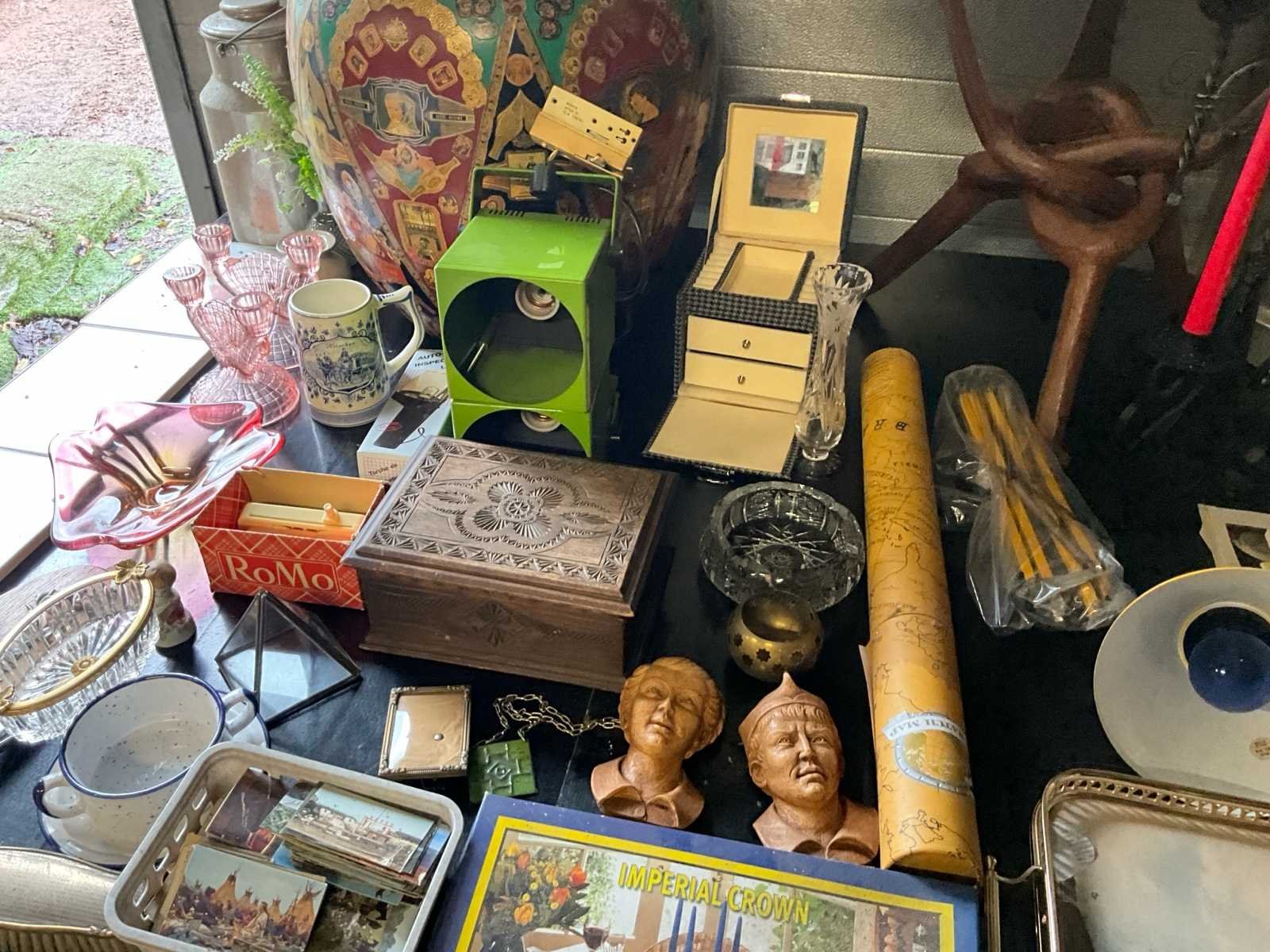 Lot diverse antieken items kast