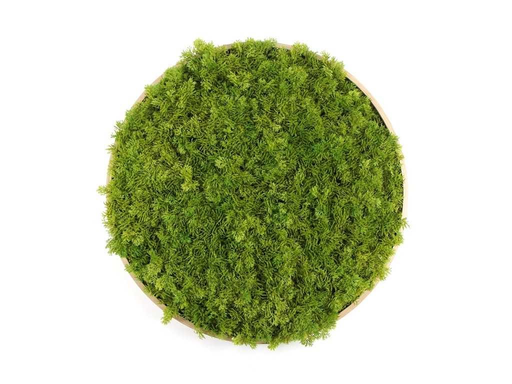 Het kunstmos is UV-bestendig en brandvertragend. Elke moscirkel is individueel verpakt in dubbelwandig karton. No Merk: Jivana Model: Moss circle Product type: artificial moss Kleur: Emerald Green Gewicht: 2.3kg Lengte: 50cm Breedte: 50cm Hoogte: 6cm