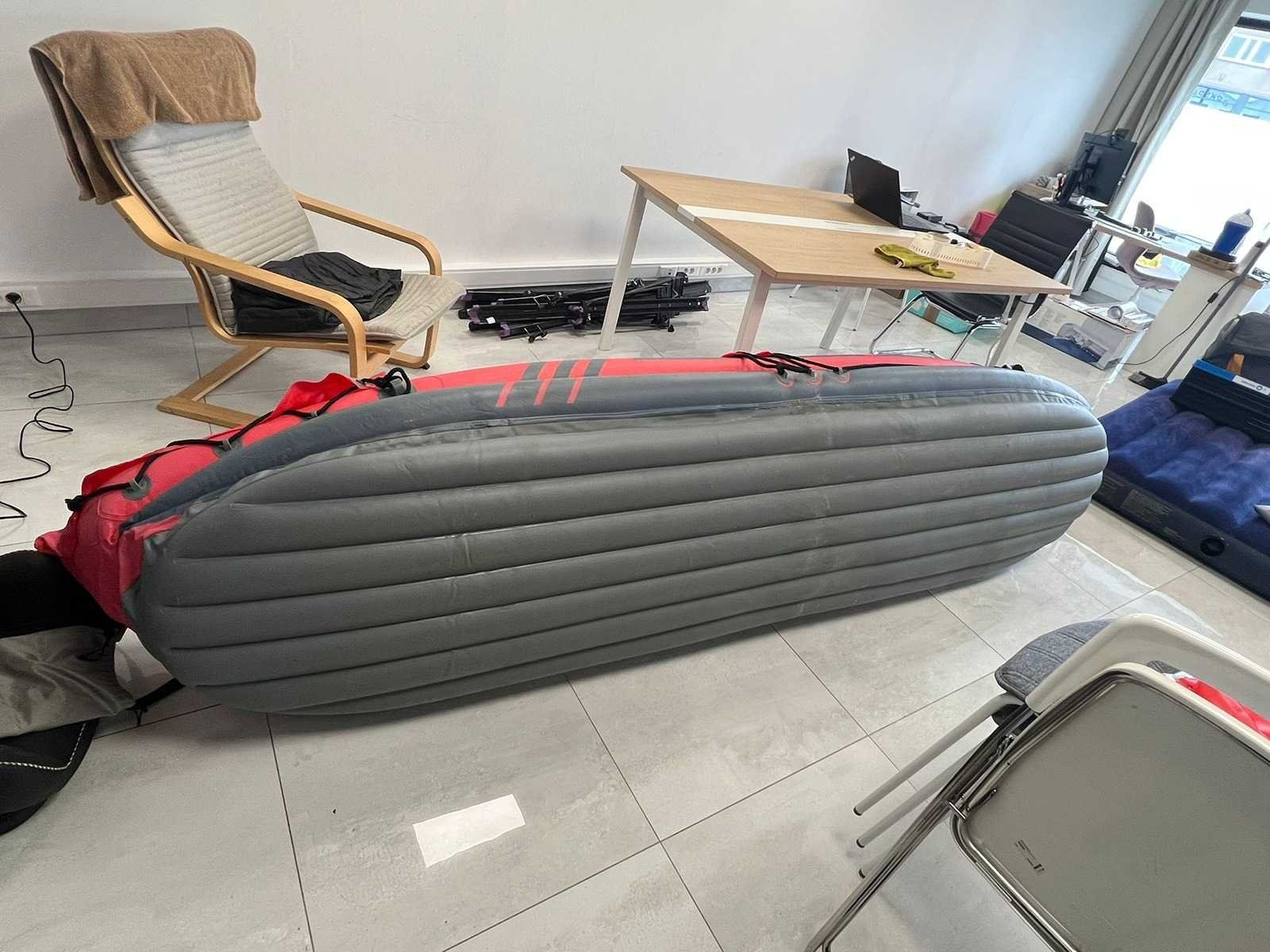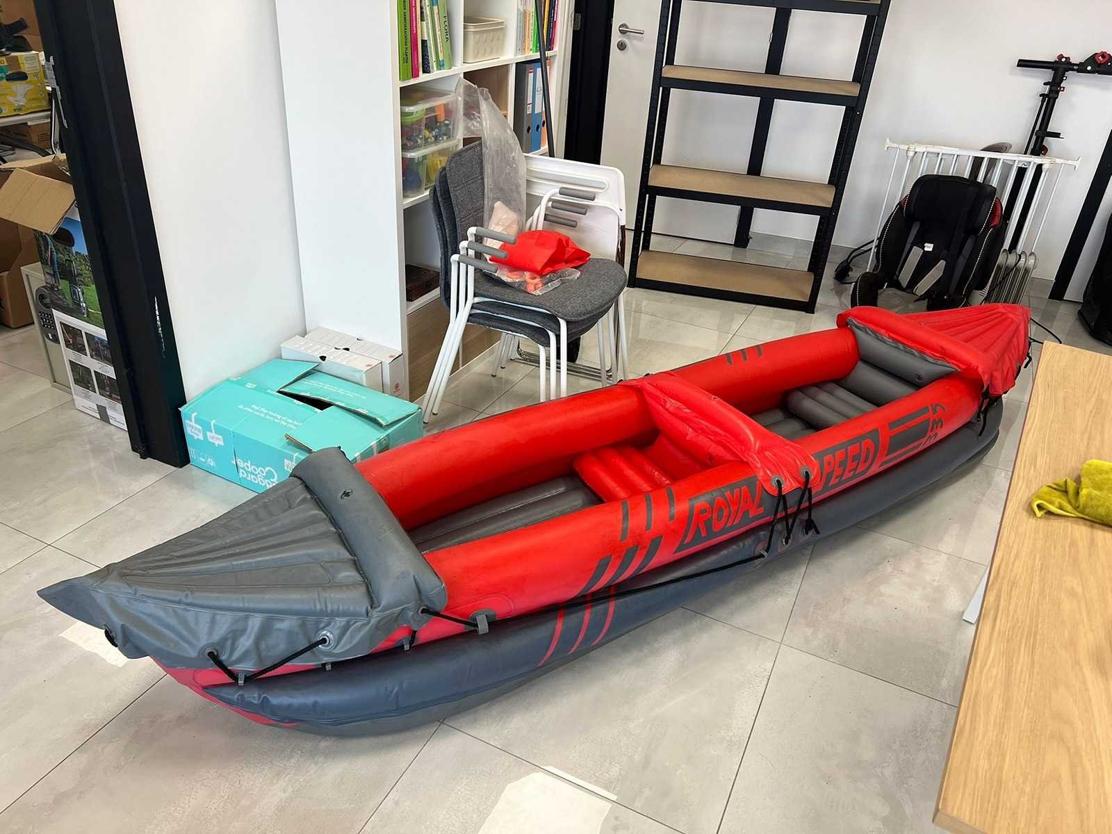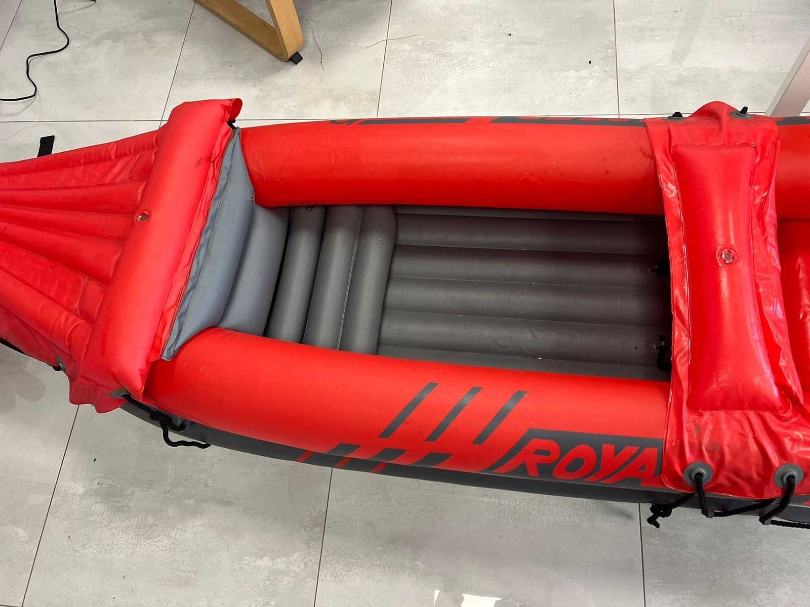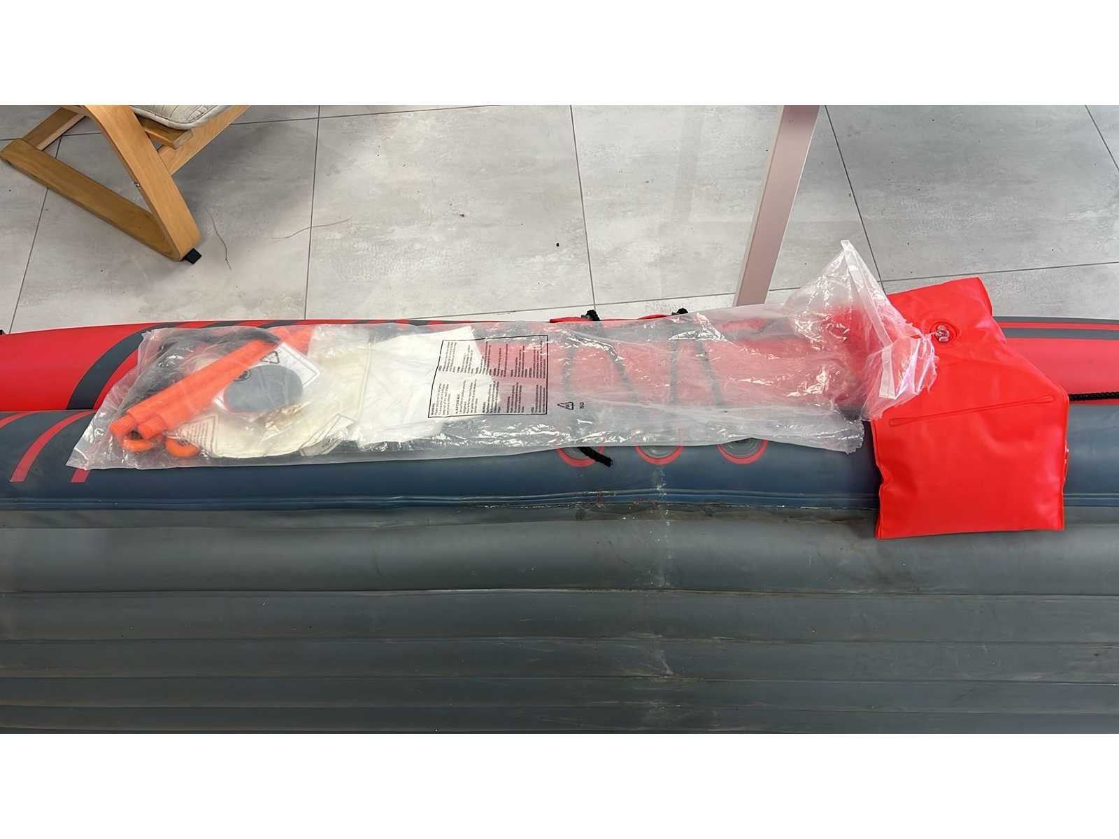Opblaasbare 2-persoons kano met stevige opblaasbare bodem. Verstevigde boeg en achterzijde. Handgrepen en bevestigingskoorden aanwezig. Inclusief accessoires (op foto zichtbaar): - Oranje bevestigingsstukken - Reparatieset / toebehoren - Ventielen aanwezig - Luchtkamers intact op foto Normale gebruikssporen (lichte vervuiling en oppervlakkige sporen zichtbaar). Niet getest op waterdichtheid tijdens gebruik (wel opgeblazen op foto). Nee Merk: Royal speed Product type: Opblaasbare kano / kajak