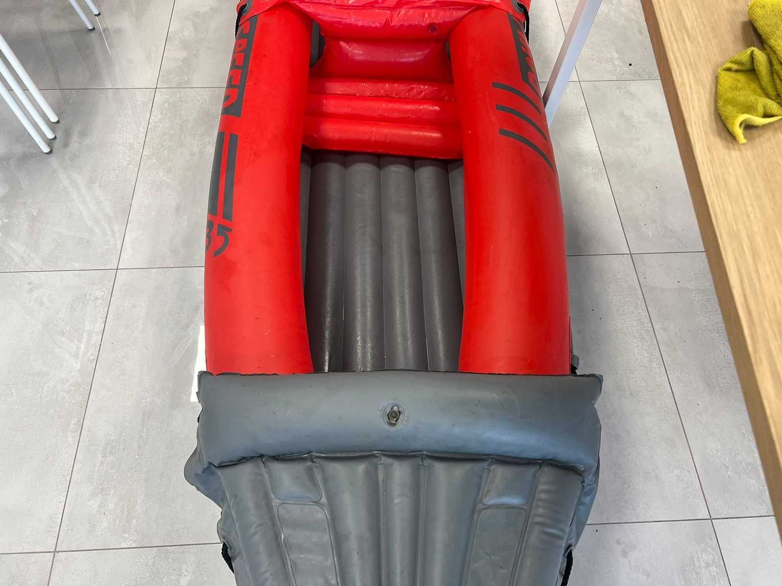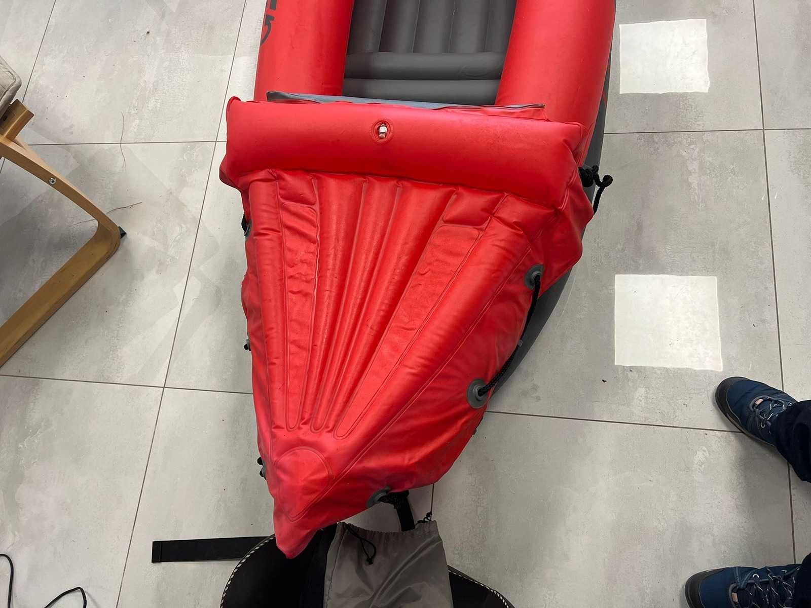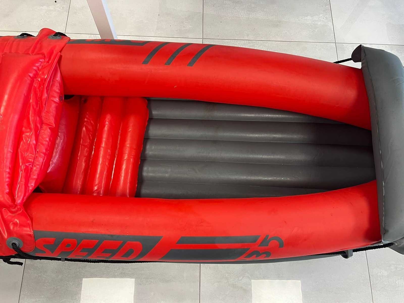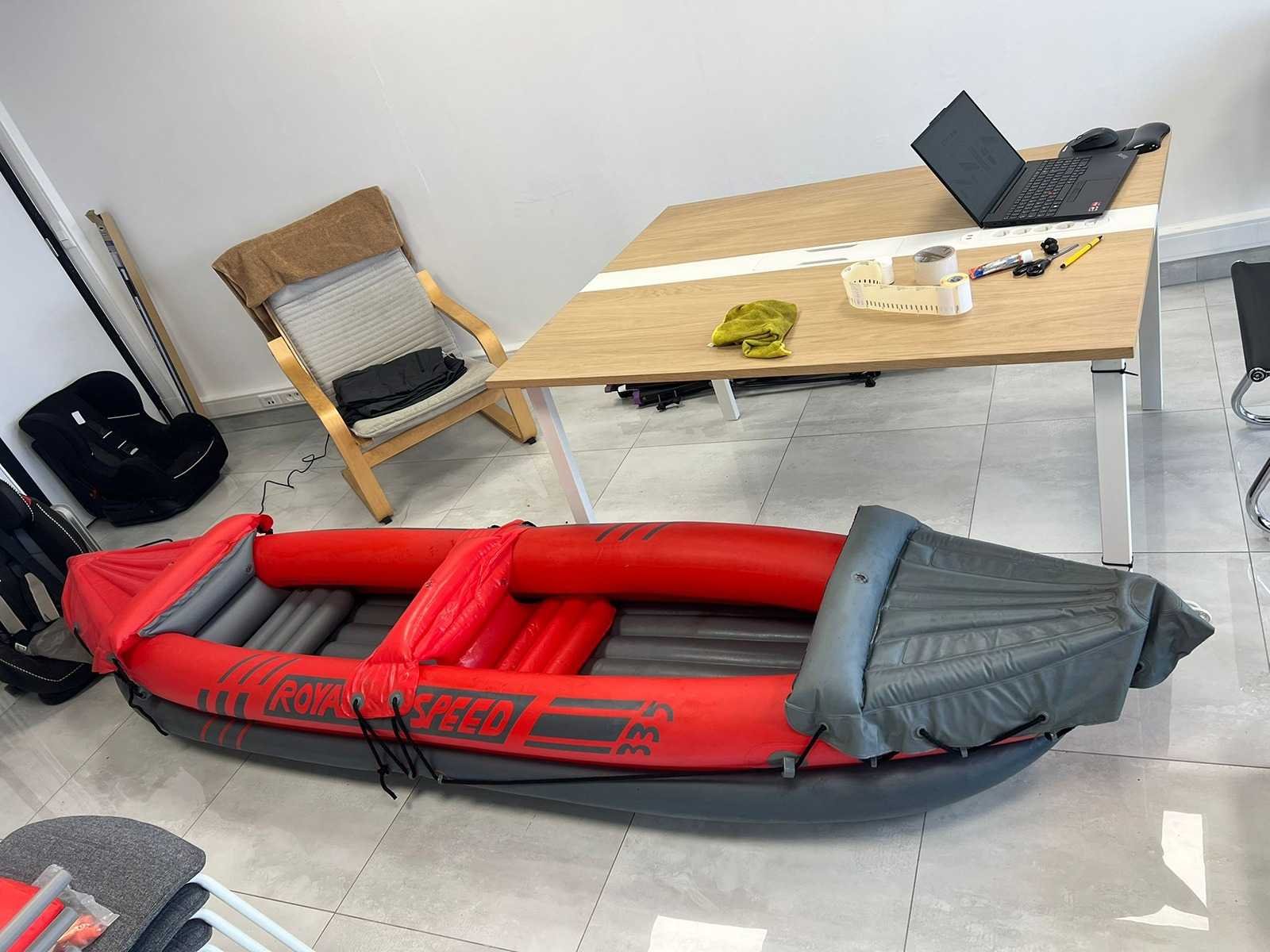 Opblaasbare 2-persoons kano met stevige opblaasbare bodem. Verstevigde boeg en achterzijde. Handgrepen en bevestigingskoorden aanwezig. Inclusief accessoires (op foto zichtbaar): - Oranje bevestigingsstukken - Reparatieset / toebehoren - Ventielen aanwezig - Luchtkamers intact op foto Normale gebruikssporen (lichte vervuiling en oppervlakkige sporen zichtbaar). Niet getest op waterdichtheid tijdens gebruik (wel opgeblazen op foto). Nee Merk: Royal speed Product type: Opblaasbare kano / kajak