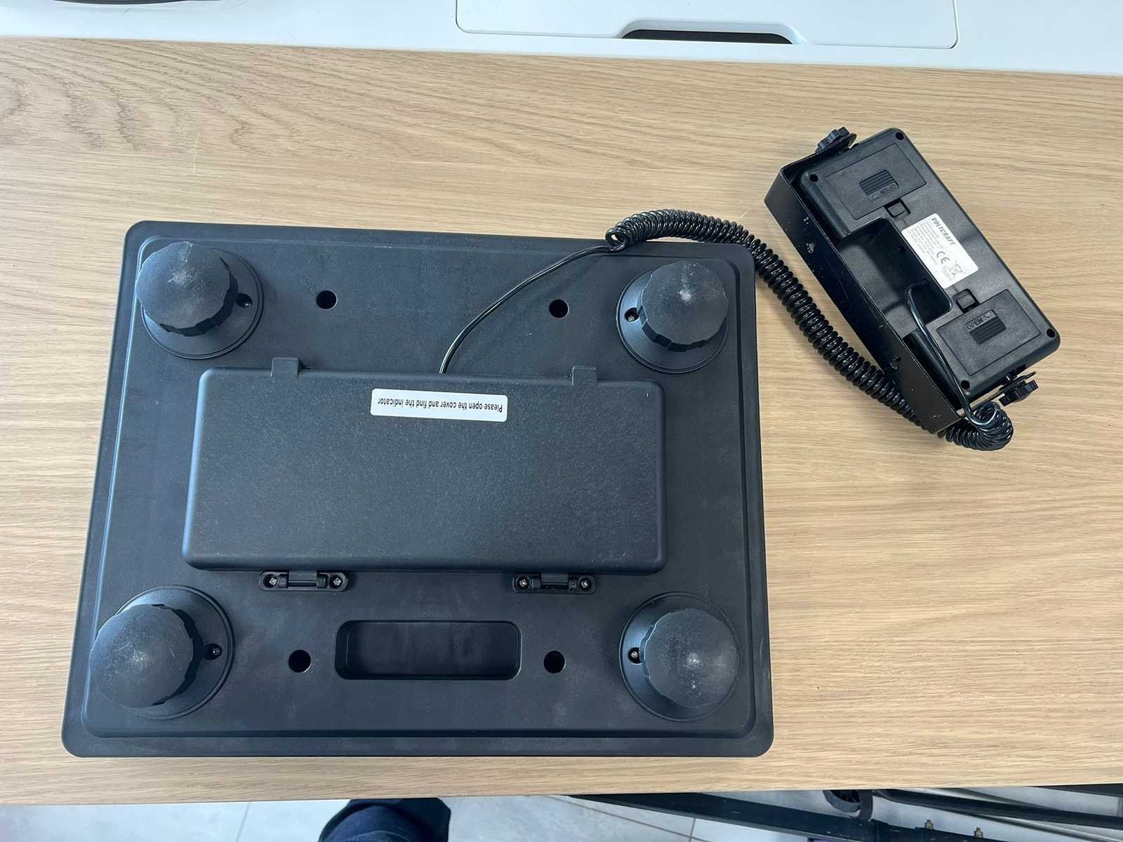 Digitale platformweegschaal met extern display. Groot RVS weegplateau. LCD-display met achtergrondverlichting. Functies: ON/OFF, UNIT, COUNT, TARE. Weergave in kg Display verbonden via spiraalkabel. Werkt op 4x 1,5V AA batterijen of via AC/DC adapter. Toestel werkt (display toont 0.00 kg op foto). Nee Merk: Voltcraft Type: PLS-220S