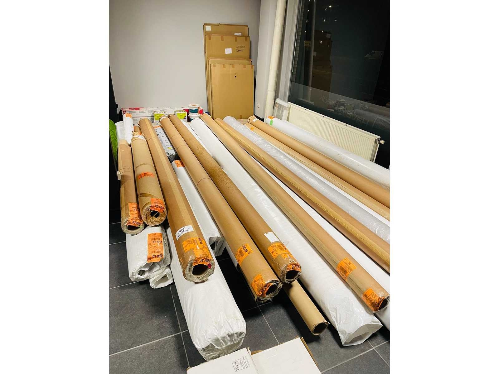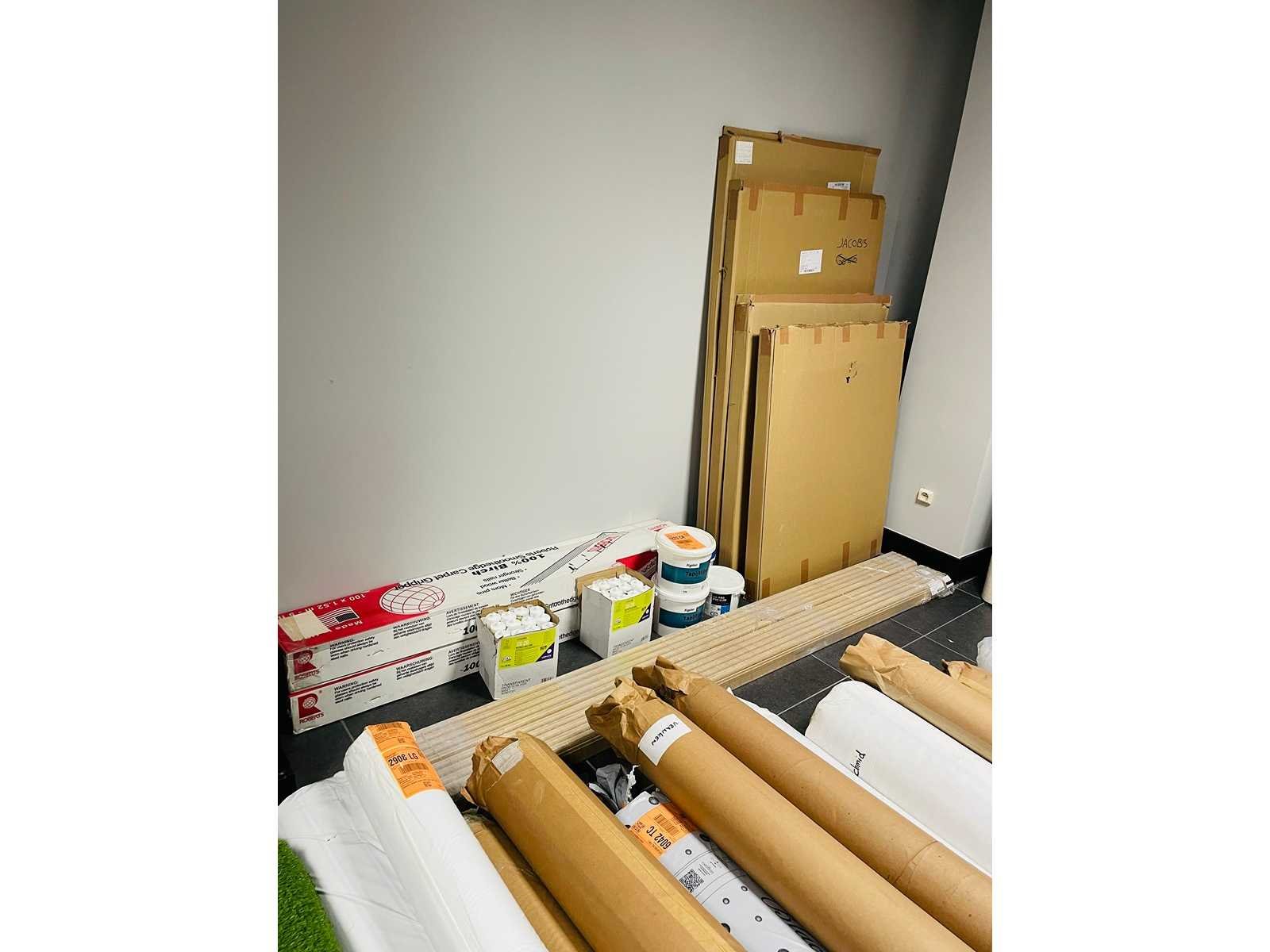 Nieuwe tapijten- Carpets - Verschillende soorten. Verschillende vloeren laminaten op 3 palletten. 5 rollen vloeren zijn open. De rest is nieuw. Alle inhoud inclusief enkel wat je ziet op de foto's! exclusief radiatoren. Wegens sluiting dient de lokaal zuiver achtergelaten te worden! No