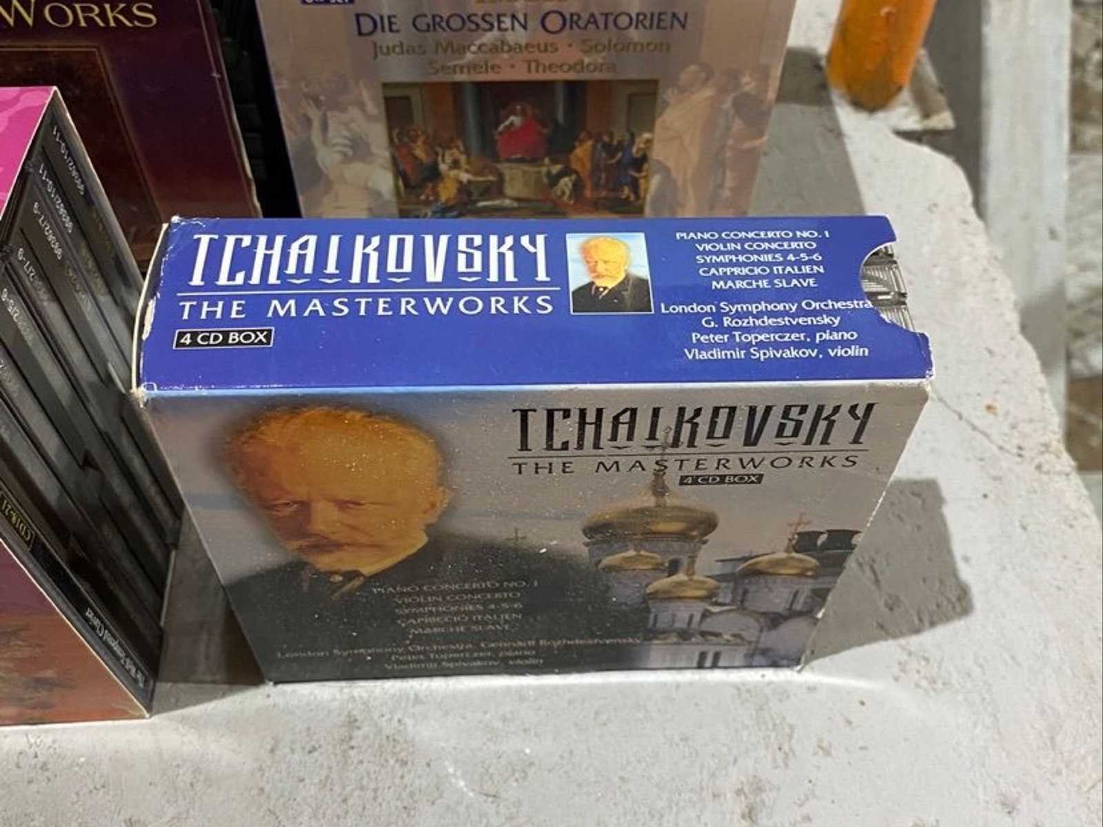 Grote verzameling klassieke muziek-cd's, waaronder verschillende meervoudige boxsets en losse albums. Componisten en zichtbare werken: Bach-editie (Orkestwerken & Concerten, Klavierwerken), Chopin – De Pianowerken (13 cd-box), Tsjaikovski – De Meesterwerken (4 cd-box), Händel – Die Grossen Oratorien, Mozart – De Meesterwerken, evenals diverse aanvullende cd's. De bundel bevat ook een bak vol extra cd's (voornamelijk klassieke muziek). Gebruikte conditie. De inhoud wordt verkocht zoals weergegeven op foto's, niet individueel geverifieerd. No