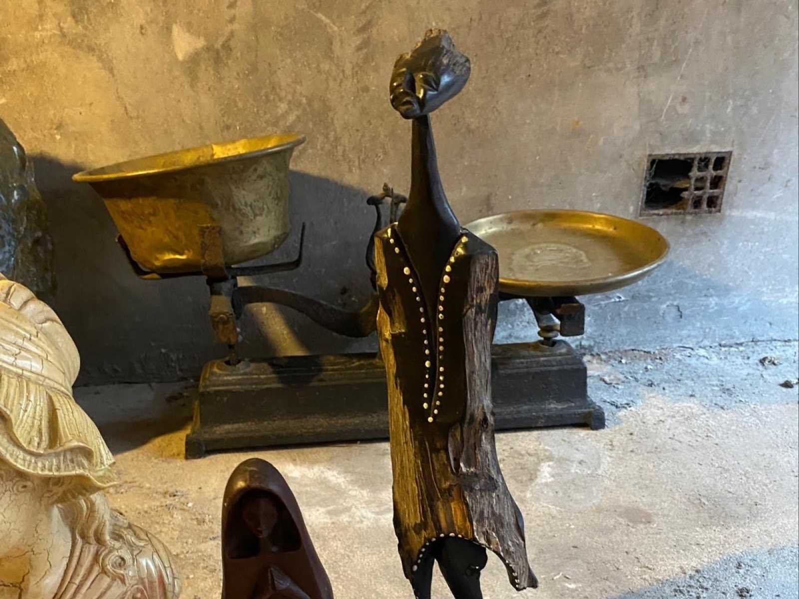 Decoratieve set bestaat uit verschillende beelden en sierlijke objecten in verschillende stijlen (etnisch, Aziatisch, klassiek en decoratief). Het perceel omvat: 2 gebeeldhouwde Aziatische vrouwenbeelden (oosterse stijl) 2 Afrikaanse houten bustes 1 Groot Afrikaans houten muurmasker 1 polychroom lachend Boeddhabeeld 1 kleine decoratieve monnik 2 klassieke kinderbusten (crackle afwerking) 1 grote gepatineerde mannenbuste (antieke stijl) 2 slanke houten beeldjes 1 hedendaagse houten sculptuur (gestileerde silhouet) 1 antieke gietijzeren weegschaal met messing schalen Diverse extra kleine decoratieve elementen Conditie: Algemene gebruiksconditie, normale tekenen van slijtage en opslag zichtbaar (zie foto's). No