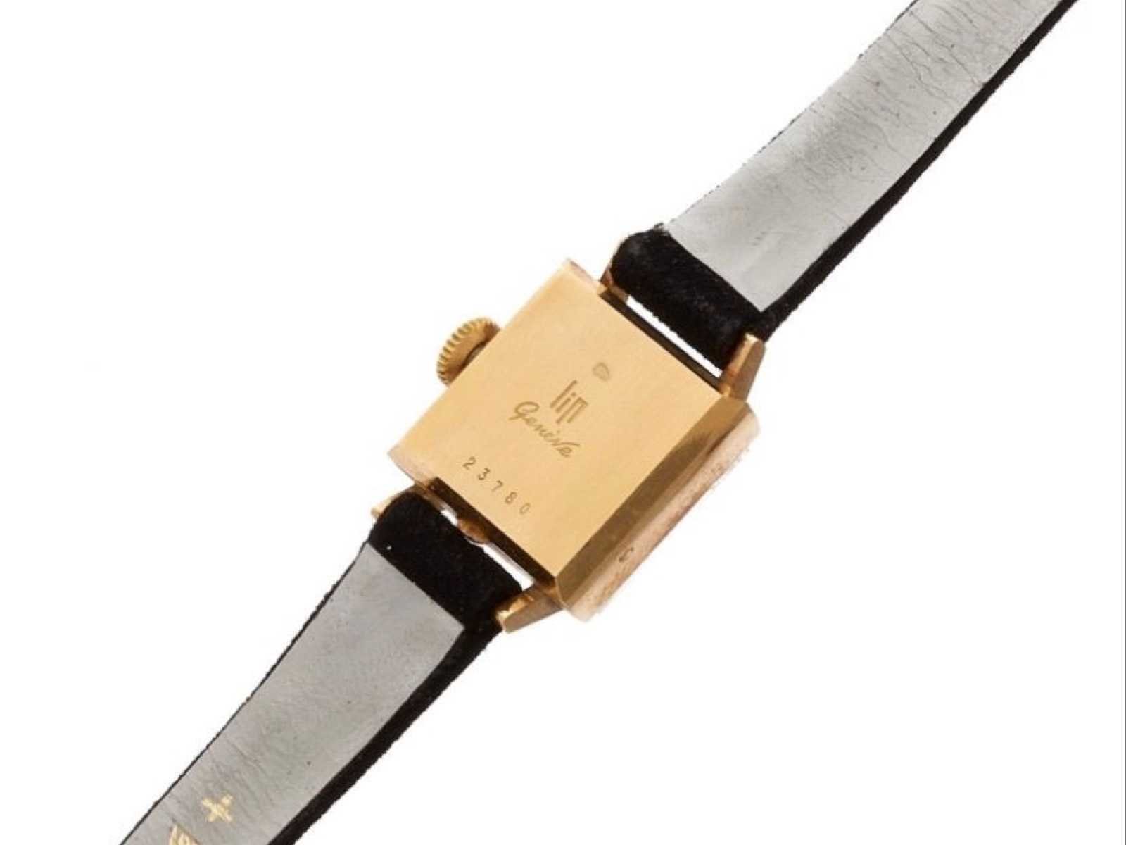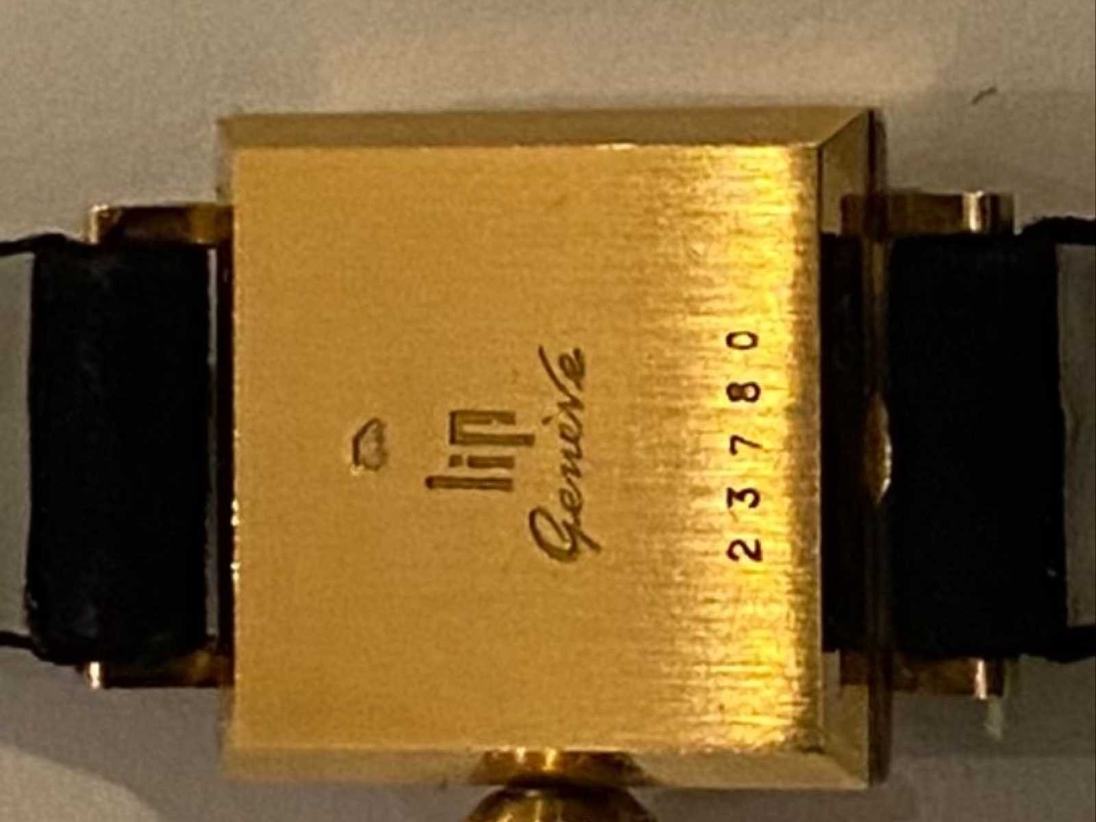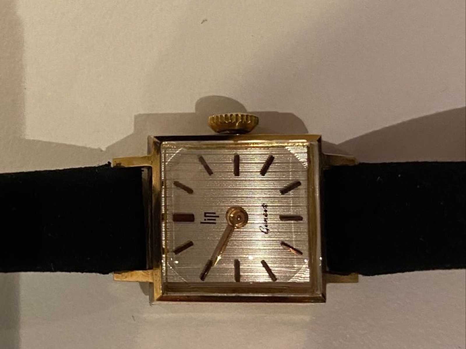 LIP Genève dameshorloge – Verguld kast – Ref. 23780 – Vintage Elegant dameshorloge van LIP Genève, vintage model met vierkante kast. Functie: Kast: verguld (geelgoudtint) Vorm: vierkant Wijzerplaat: verzilverd met vergulde batonindexen Goudgeplateerde wijzers Handmatige winding (zijkroon) Zwarte riem Goudkleurige speldgesp Kijk met een sober ontwerp dat typisch is voor de jaren 60 en 70. No Merk: Lip Genève Model: Femme Referentienummer: 23780