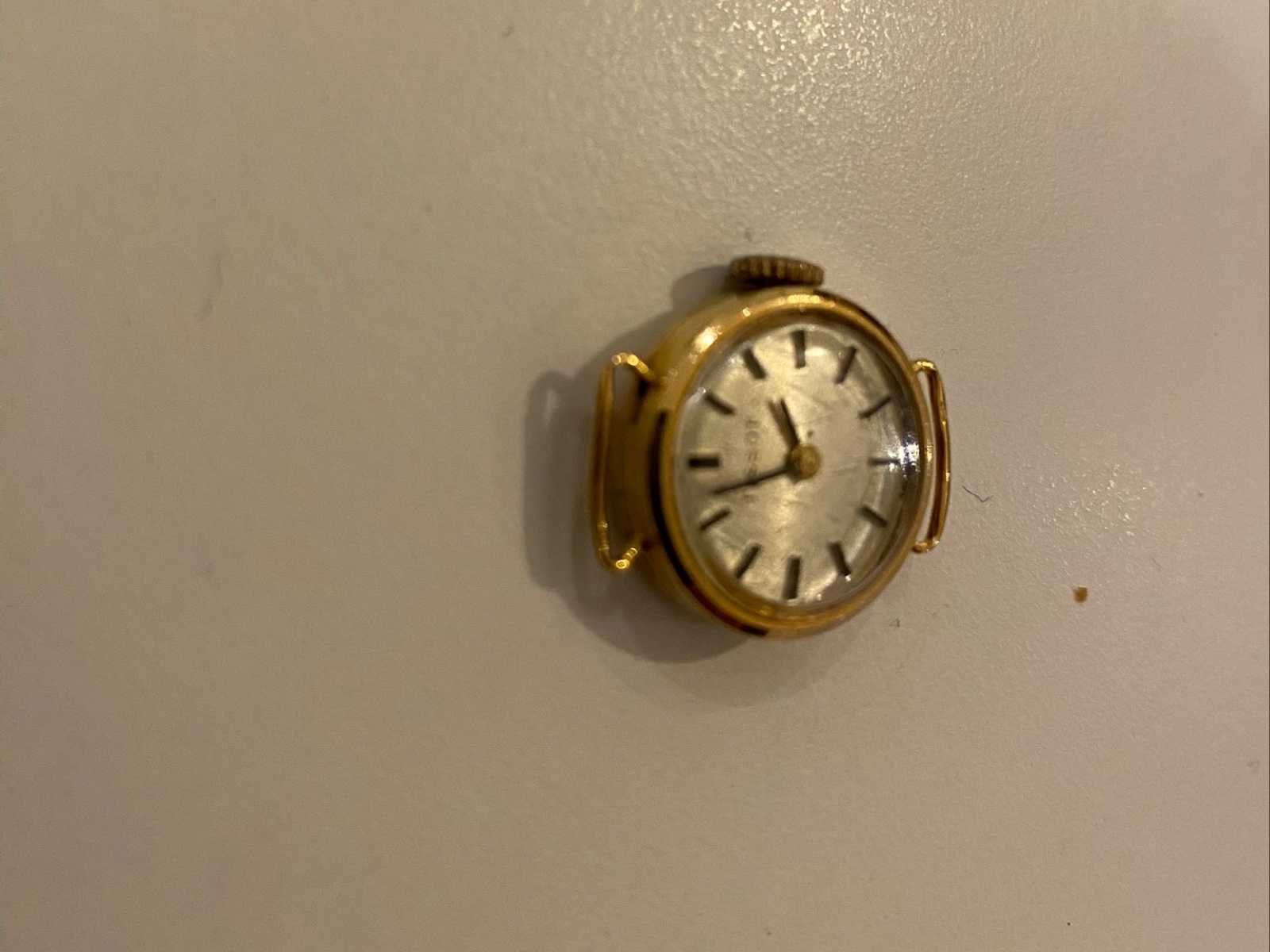 Vintage Tissot polshorloge – 18 karaats gouden kast (merken op de achterkant van de kast, te controleren adelaarshoofd – gouden titel niet bevestigd door Vavato - Troostwijk) dame Antieke Tissot polshorloge, damesmodel, met de hand opgewonden. De ronde koffer Verzilverde wijzerplaat met bijpassende batonindexen en wijzers. Ondertekende zijkroon. Gemonteerd op een zwart gevlochten armbandje (waarschijnlijk later vervangen). Kenmerken: Merk: Tissot Type: Dameshorloge Uurwerk: Mechanisch handgewonden Kast: Goudkleurig metaal Wijzerplaat: Zilver met batonindexen Armband: Zwart gevlochten Conditie: Tweedehands Status: Horloge in gebruikte staat met zichtbare slijtagesporen (micro-krassen op de kast en achterkant). Werking niet getest in de loop van de tijd (indien nodig herzien). Verkocht zoals het is No Merk: Tissot Bouwjaar: 1960