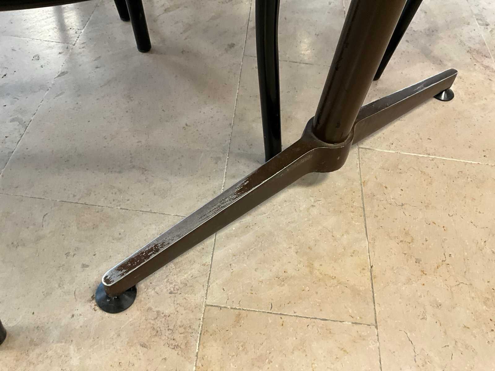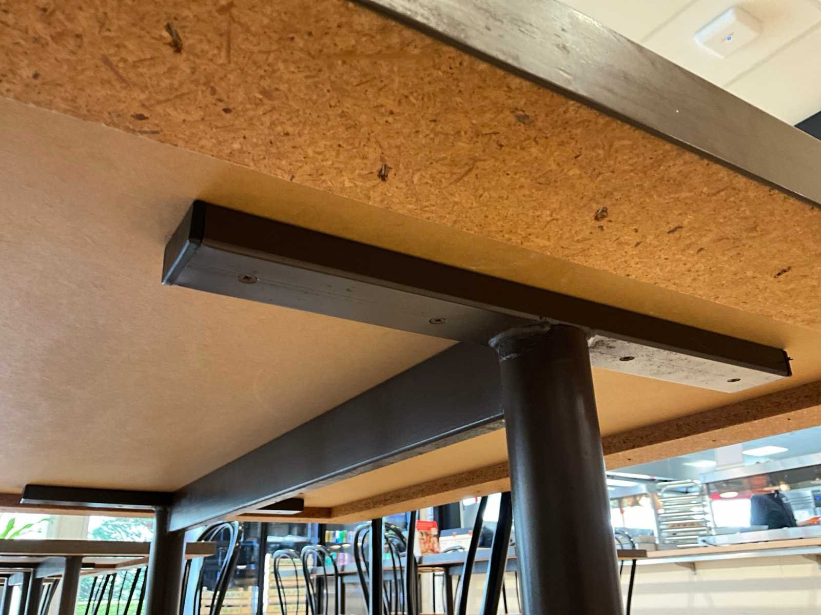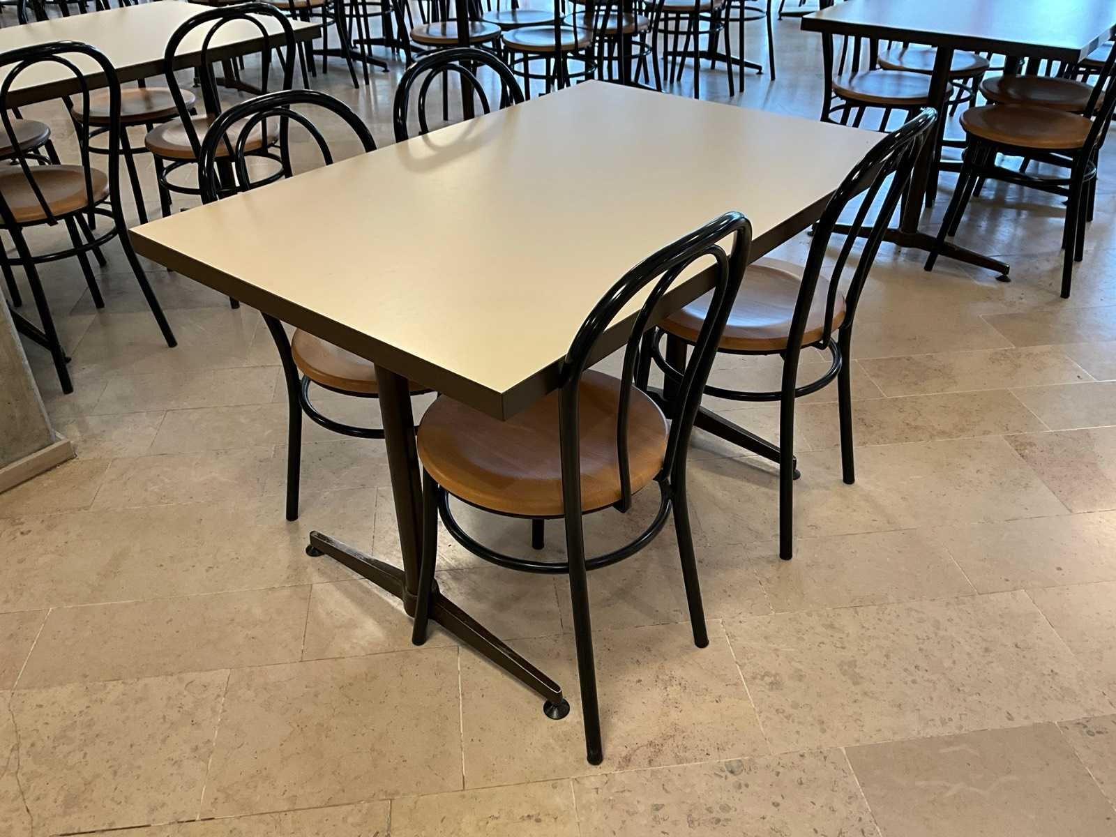 Bestaande uit 10x tafel en 40x stoel. Tafels met metalen onderstel 120x80cm. Stoelen met houten zitting en metalen onderstel. Nee