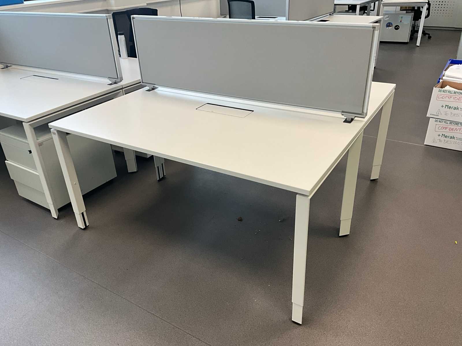 Bestaande uit 2x Bureau 160x80cm en 1x akoestische scheidingswand 160x46cm. In hoogte verstelbaar. Voorzien van kabeldoorvoer Nee Merk: STEELCASE Lengte: 80cm Breedte: 160cm Materiaal: Hout, metaal
