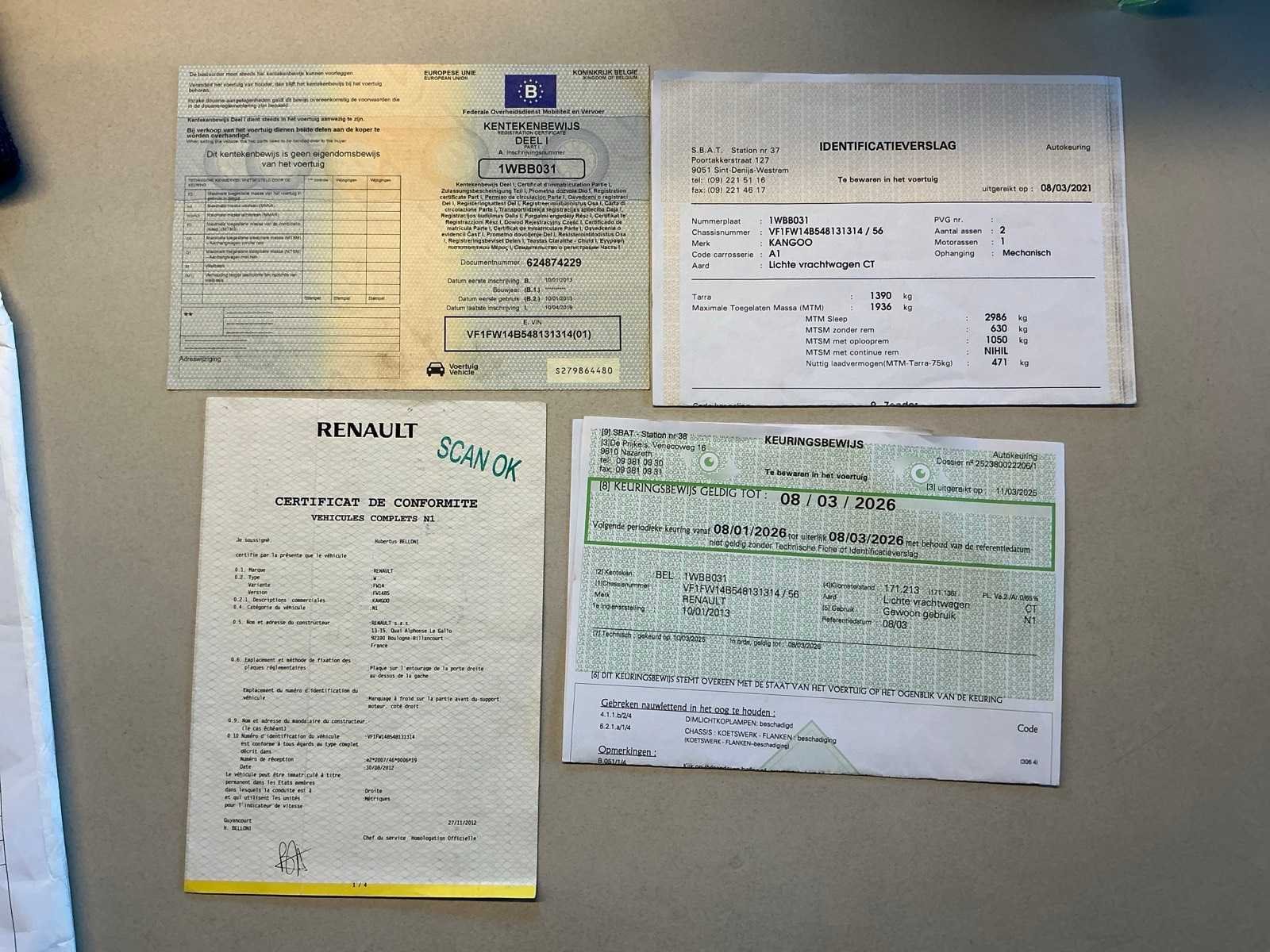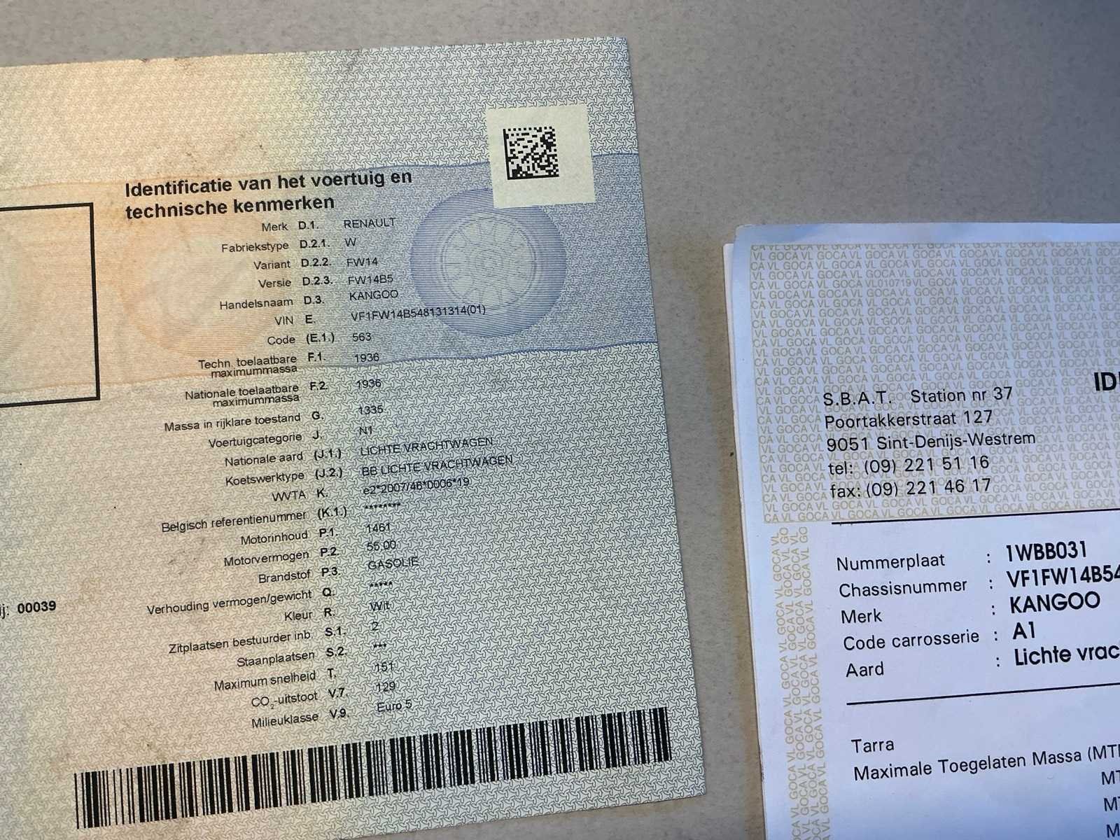 Koppelingspedaal ingedrukt/defect Nee Merk: Renault Model: Kangoo Bouwjaar: 2013 Cilinderinhoud: 1461cc Vermogen (kW): 55kW Brandstof: diesel Chassisnummer: VF1FW14B548131314 Datum eerste toelating: 10/01/2013 Transmissie: Handgeschakeld Emissieklasse: Euro 5 Aantal sleutels: 1 Nationaliteit documenten: België Gelijkvormigheidsattest aanwezig: true Start en rijdt: Ja, maar rijdt niet. Keuringsrapport geldig tot: 08/03/2026 Andere boorddocumenten: ID verslag Vavato voert geen technische keuring uit.: true Inschrijvingsbewijs - deel 1 : Aanwezig Inschrijvingsbewijs - deel 2: Niet aanwezig